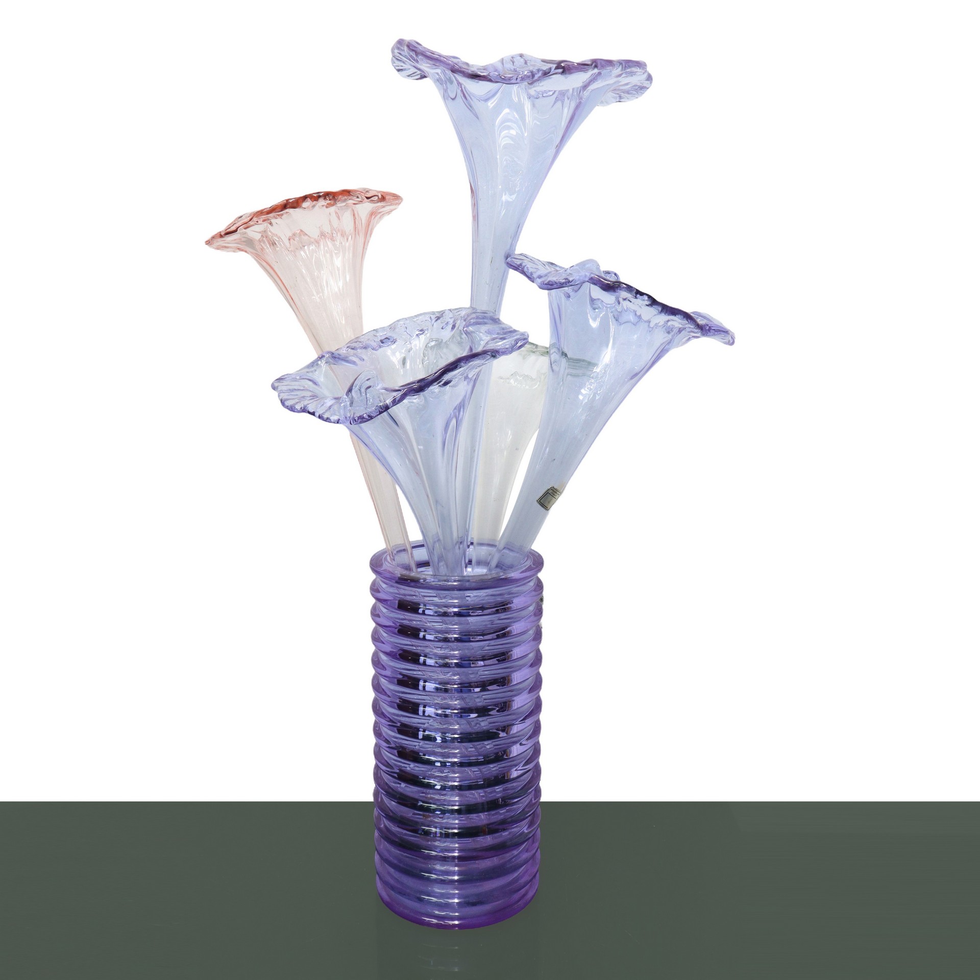 Vaso a cilindro in vetro di murano viola con cinque grandi fiori soffiati a mano