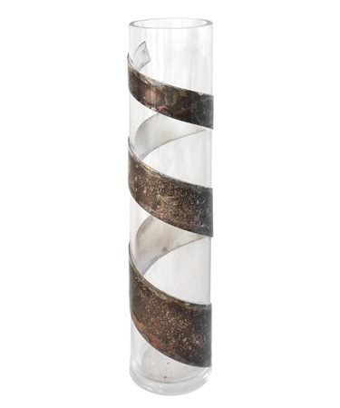 Lino Sabattini per Sabattini - Vaso Cilindrico in vetro trasparente, 60's h cm 48; diametro cm 10 Con applicazione spiroidale di fasce in metallo argentato. Marchio incusso della manifattura. Presenti segni di ossidazione.