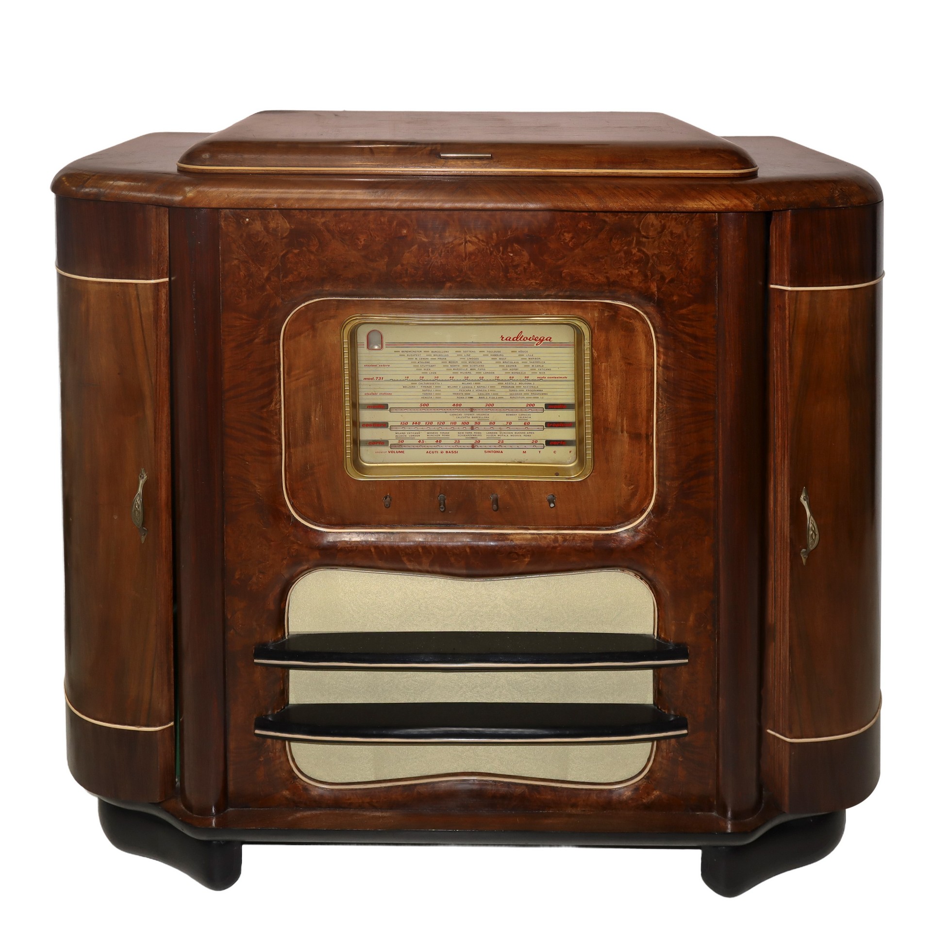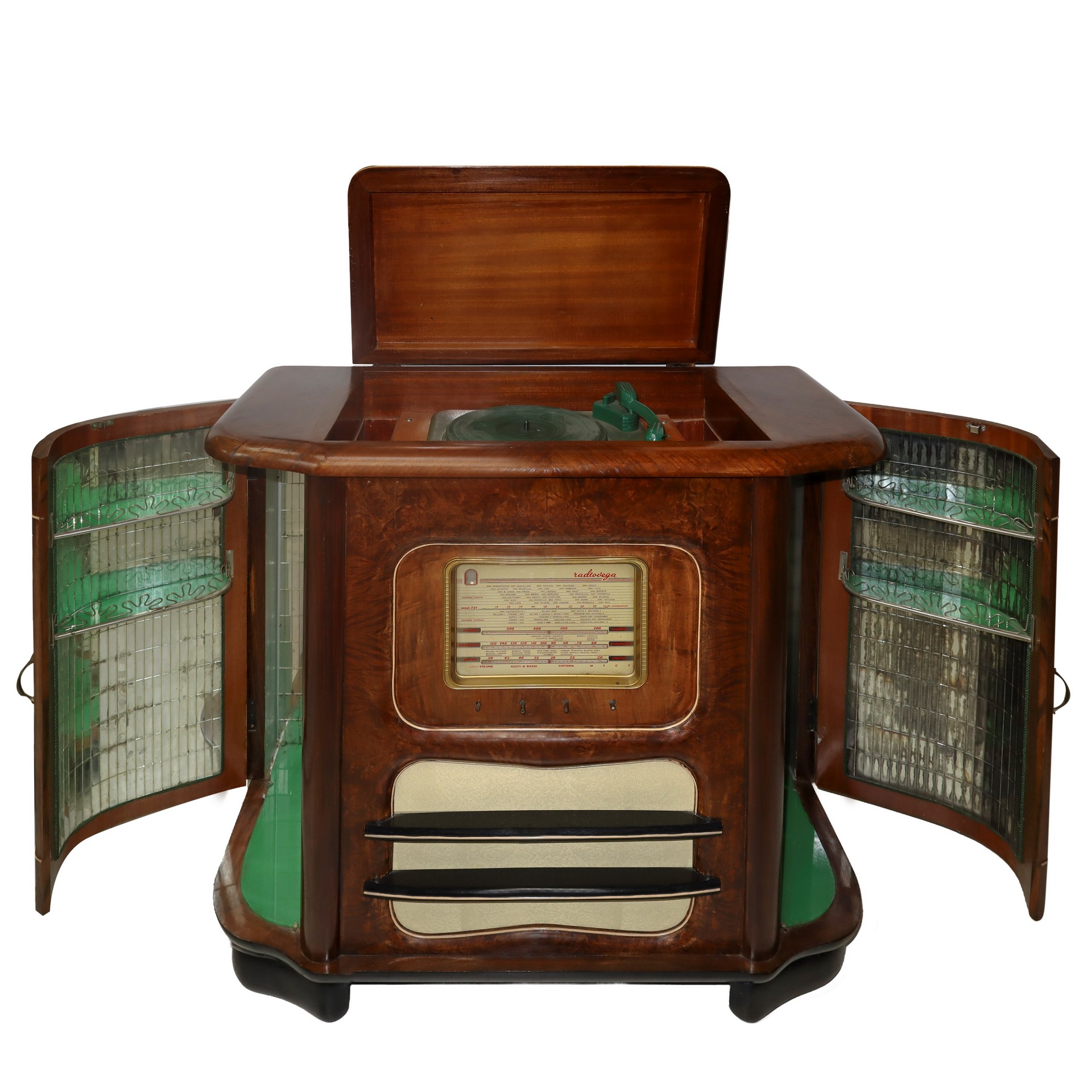 Mobile Radio e bar H cm 83x94x 43 Radio Vega e giradischi con sportelli laterali con mosaico di specchi. Radio Vega e giradischi con sportelli laterali con mosaico di specchi.