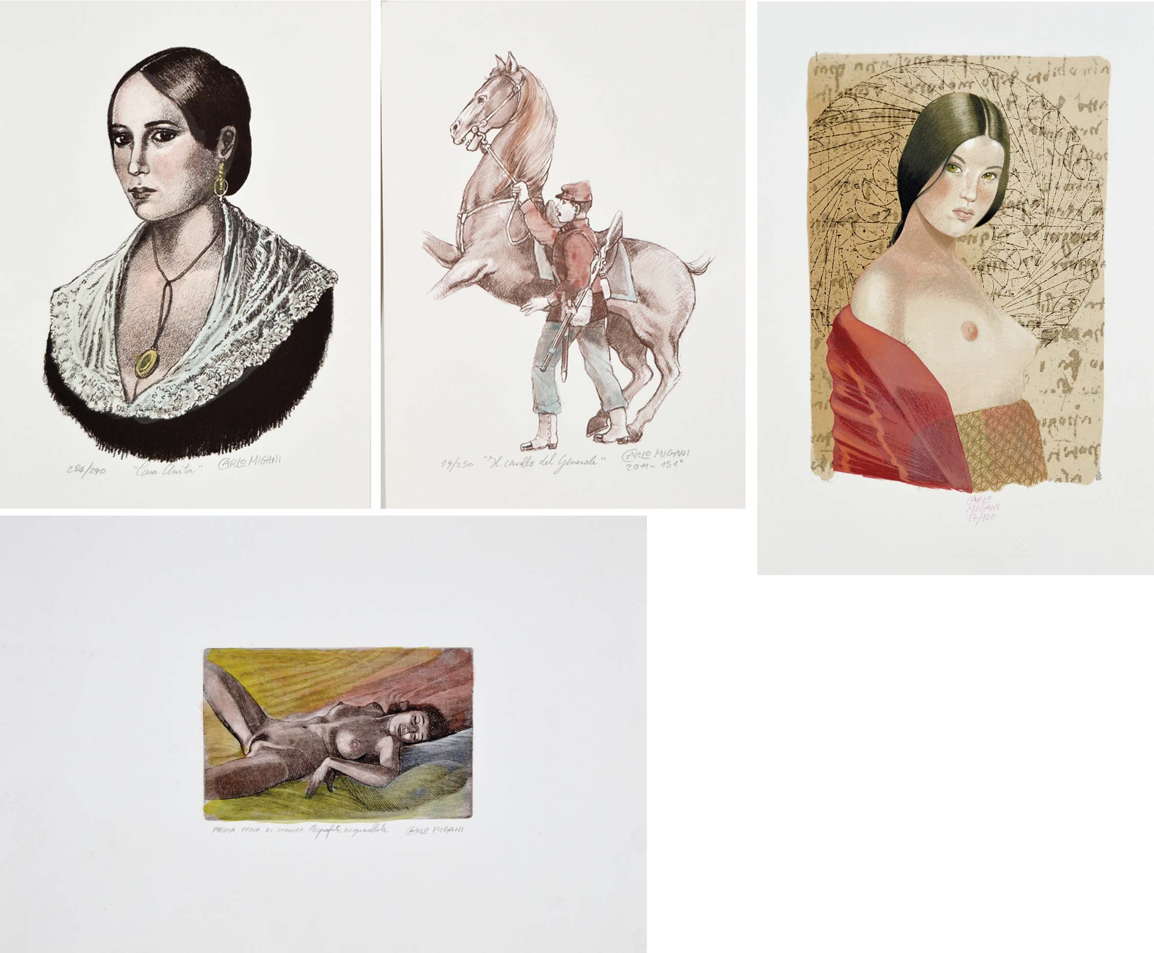 MIGANI CARLO Soggetti vari lotti di 4 grafiche Tutte firmate e numerate "Cara Anita" cm. 35x25 serigrafia es. 284/290 "Il Cavallo del generale" cm. 35x25 serigrafia es. 19/250 "La Giovane Cecilia" cm. 51x35 serigrafia es.17/120 "Nudo disteso" cm. 49x35 acquaforte acquerellata es. p.d.a.