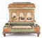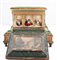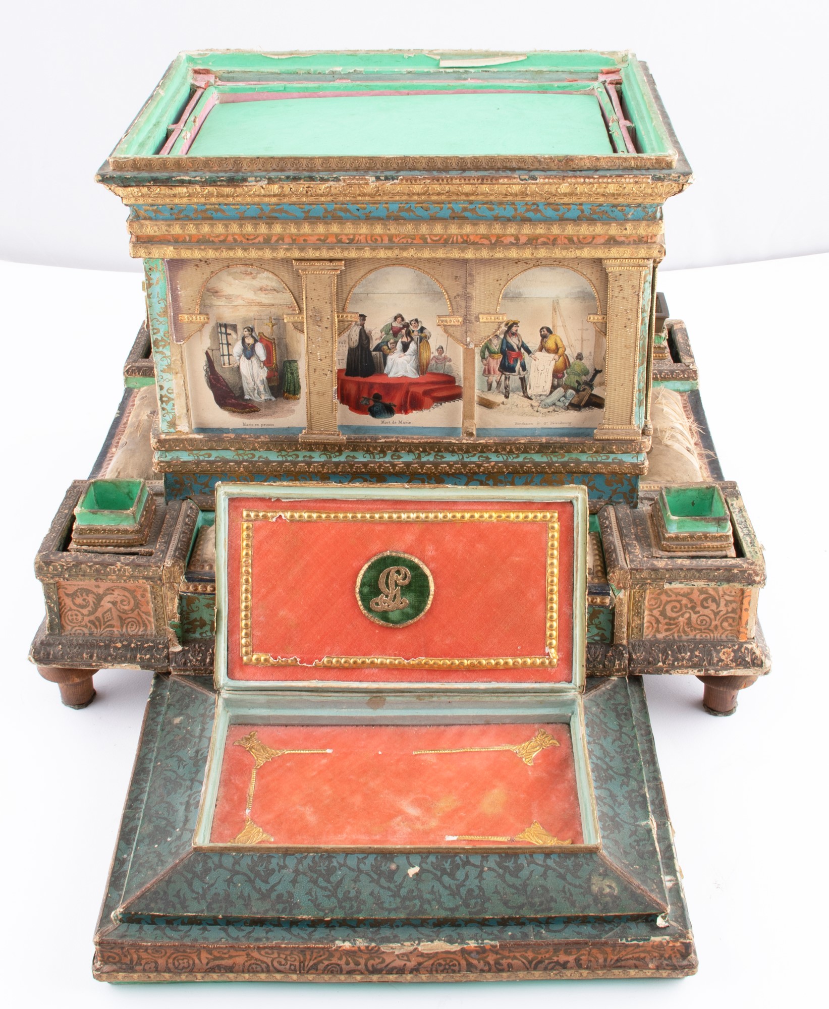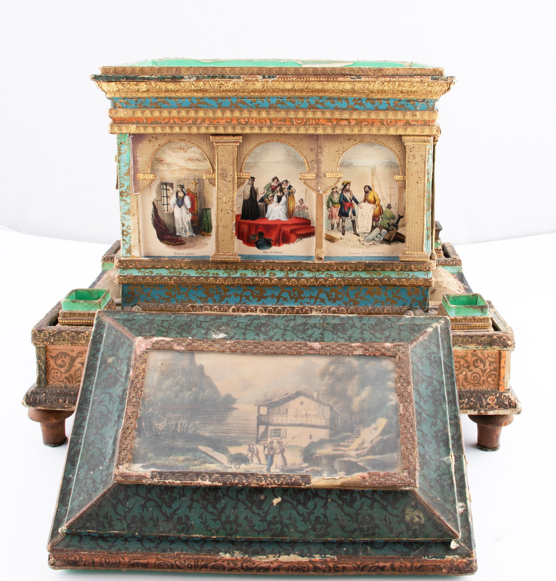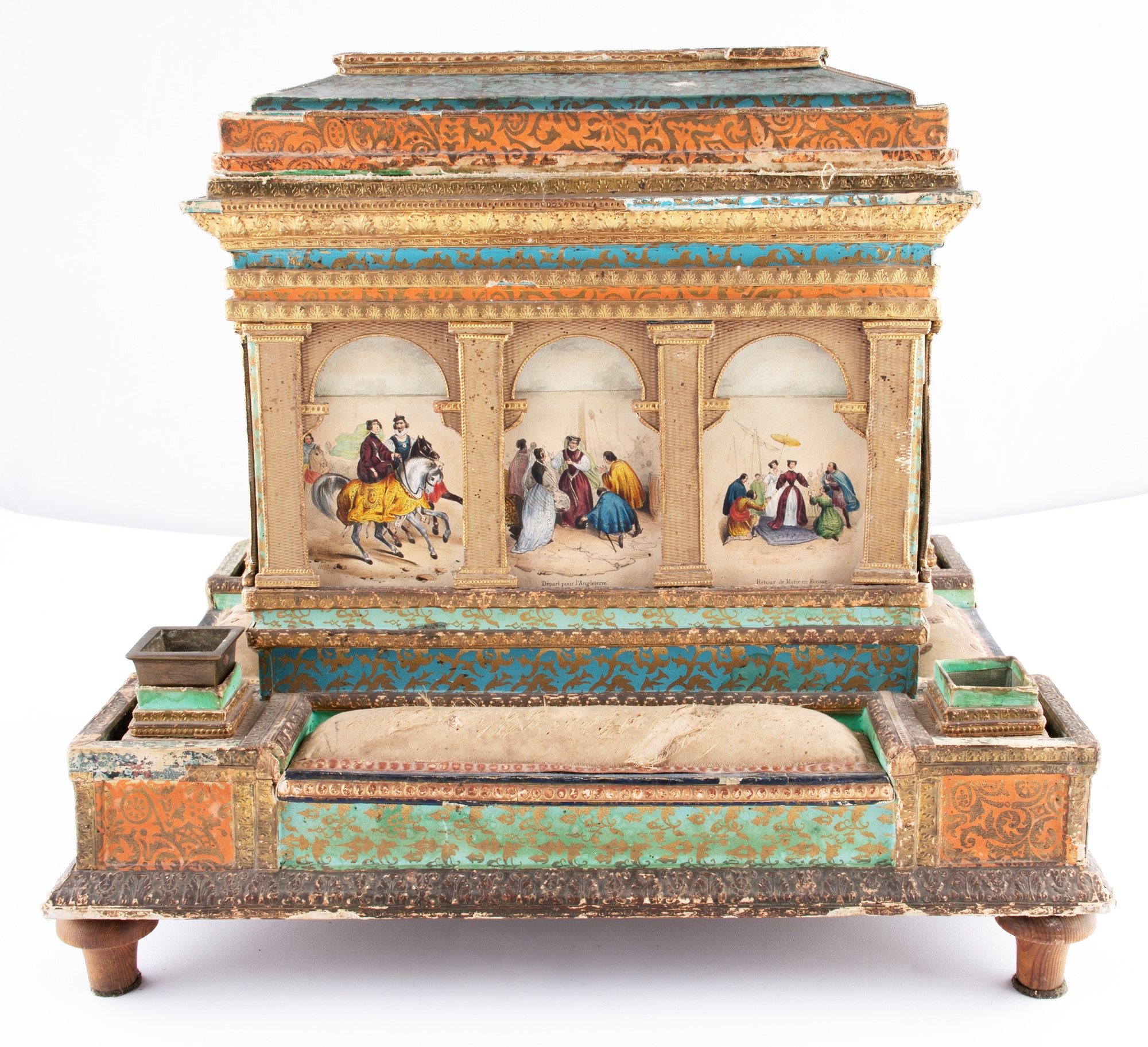 Sul fronte insistono 4 scene cavalleresche per ogni lato montate utilizzando incisioni acquerellate dell'epoca all'interno di elementi architettonici ad arco. Analizzando i costumi si desume che la scatola - tempio sia databile agli anni '40 del XIX secolo. Ai quattro lati sul piano, coperchi lunghi e imbottiti celano scomparti per riporre oggetti.