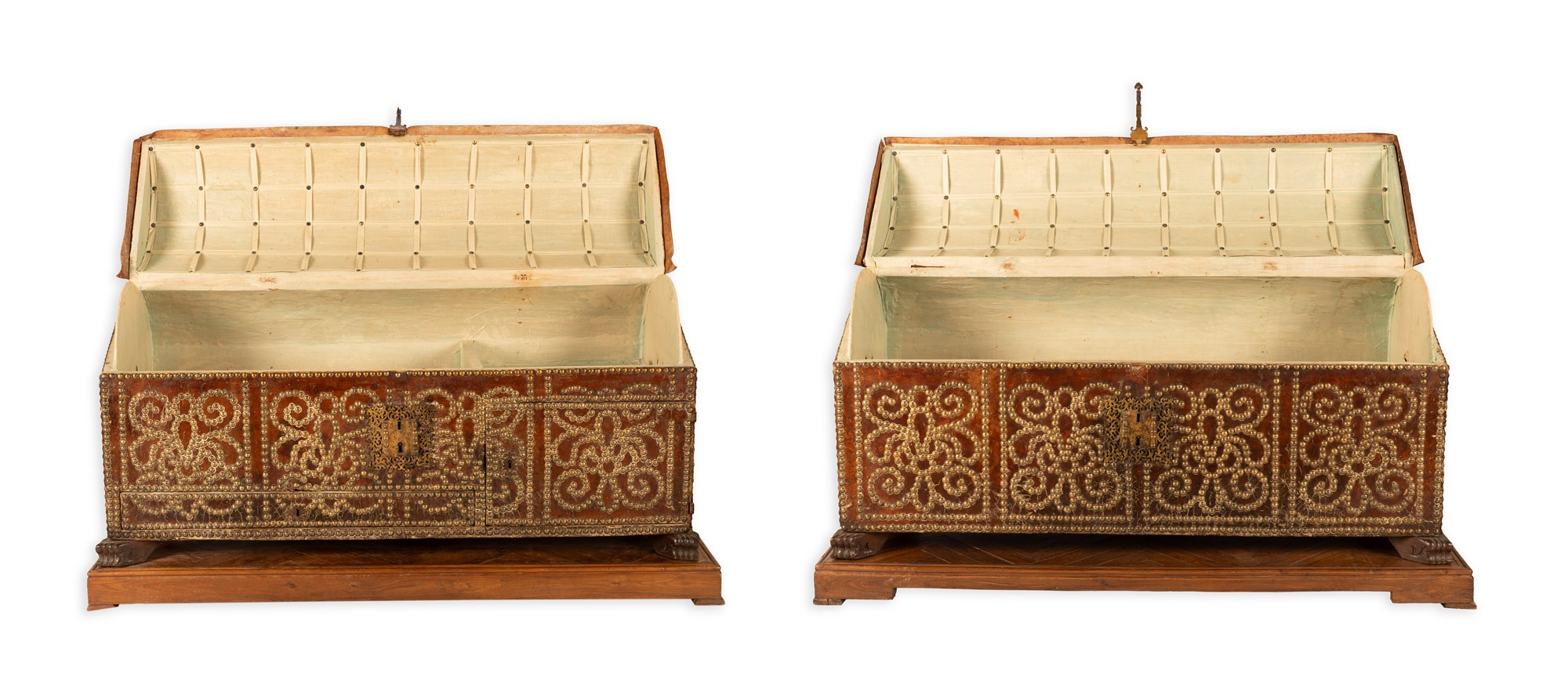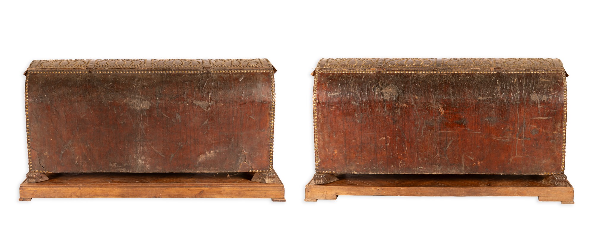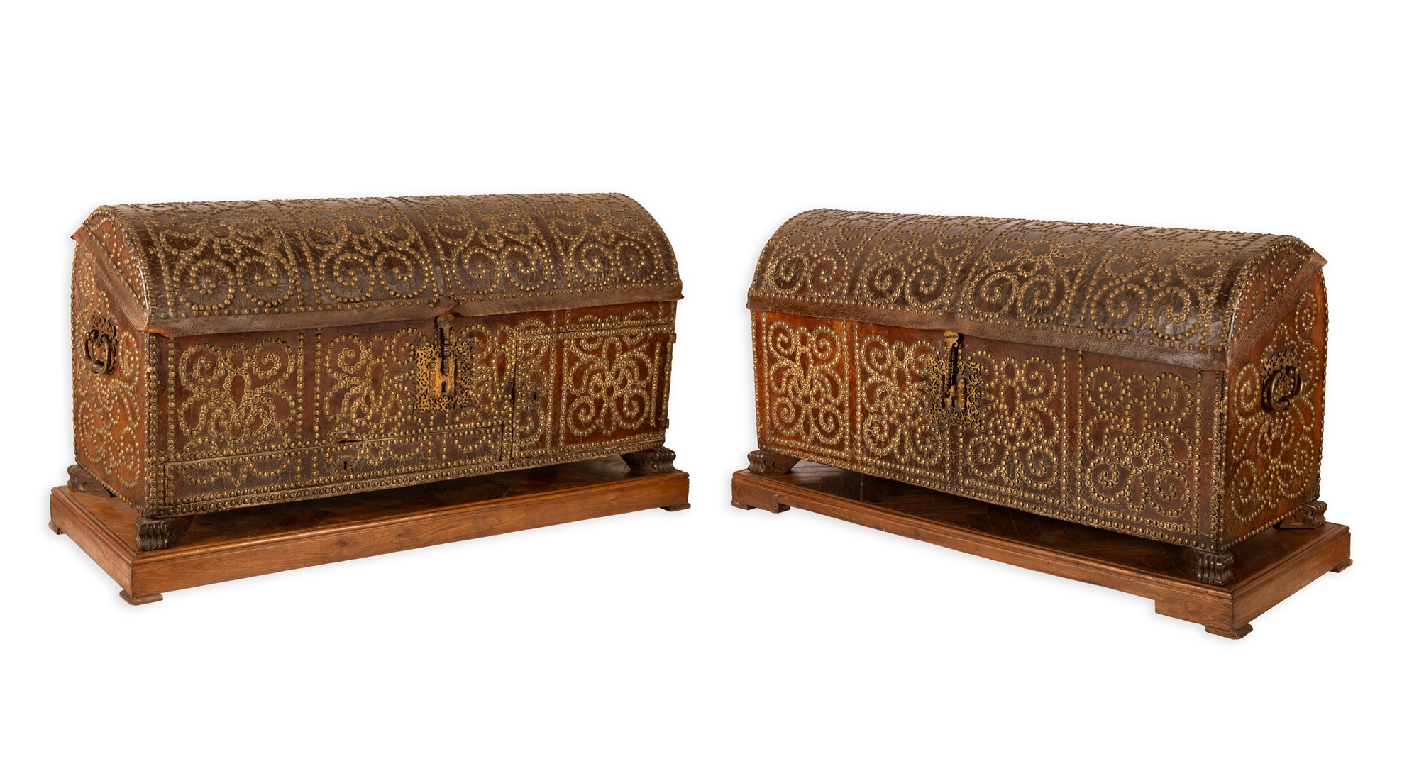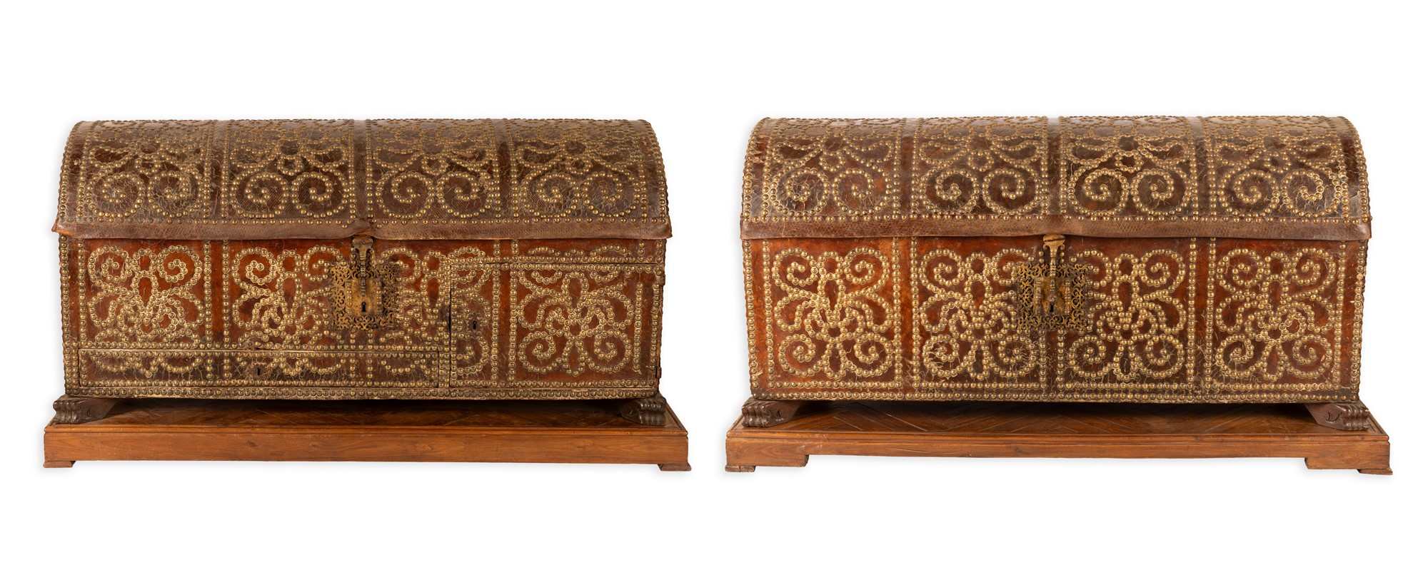 Coppia di bauli da viaggio con piano arcuto. Foderati in cuoio e decorati con borchie in ottone disposte a ricche volute. Manifattura spagnola del XVII secolo