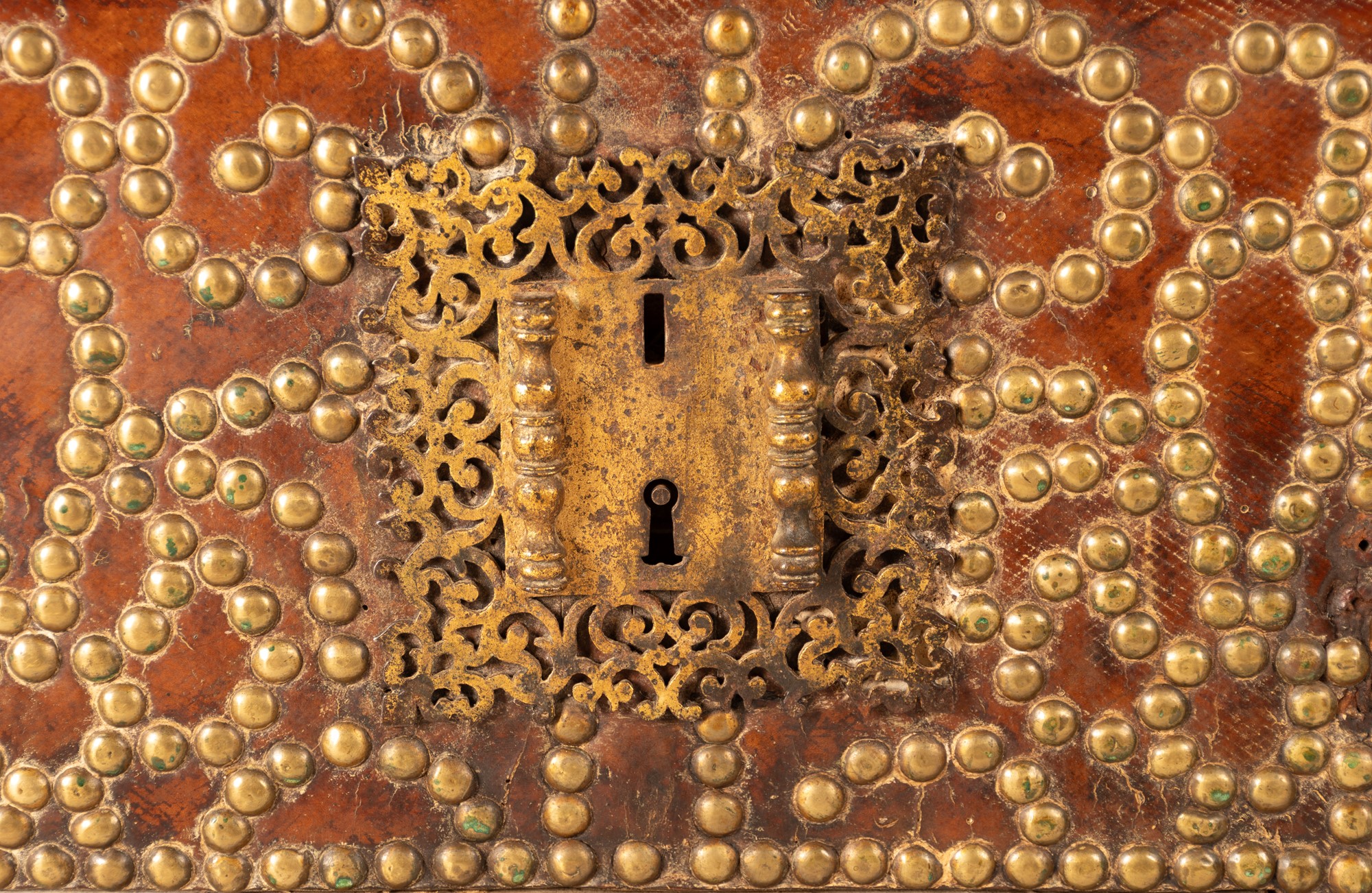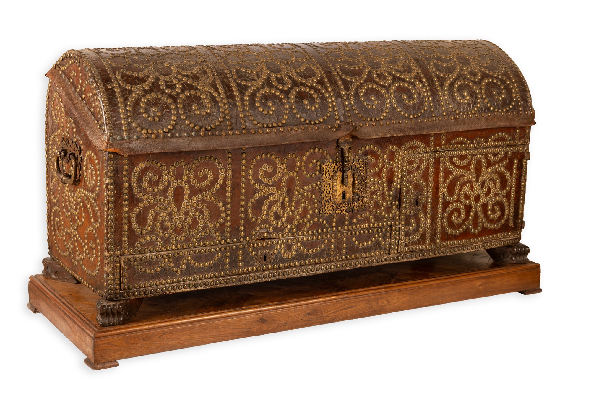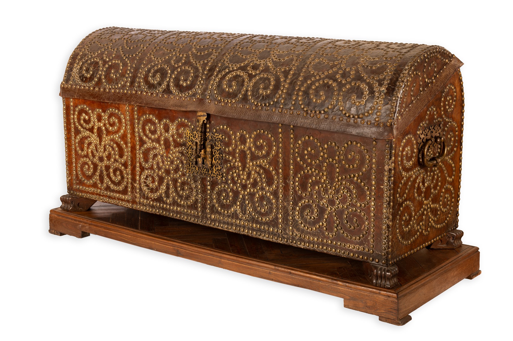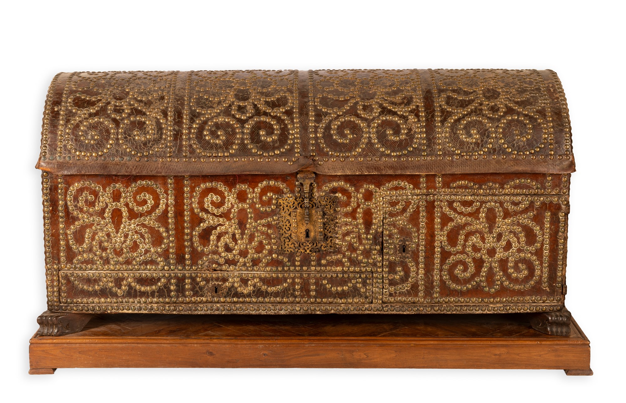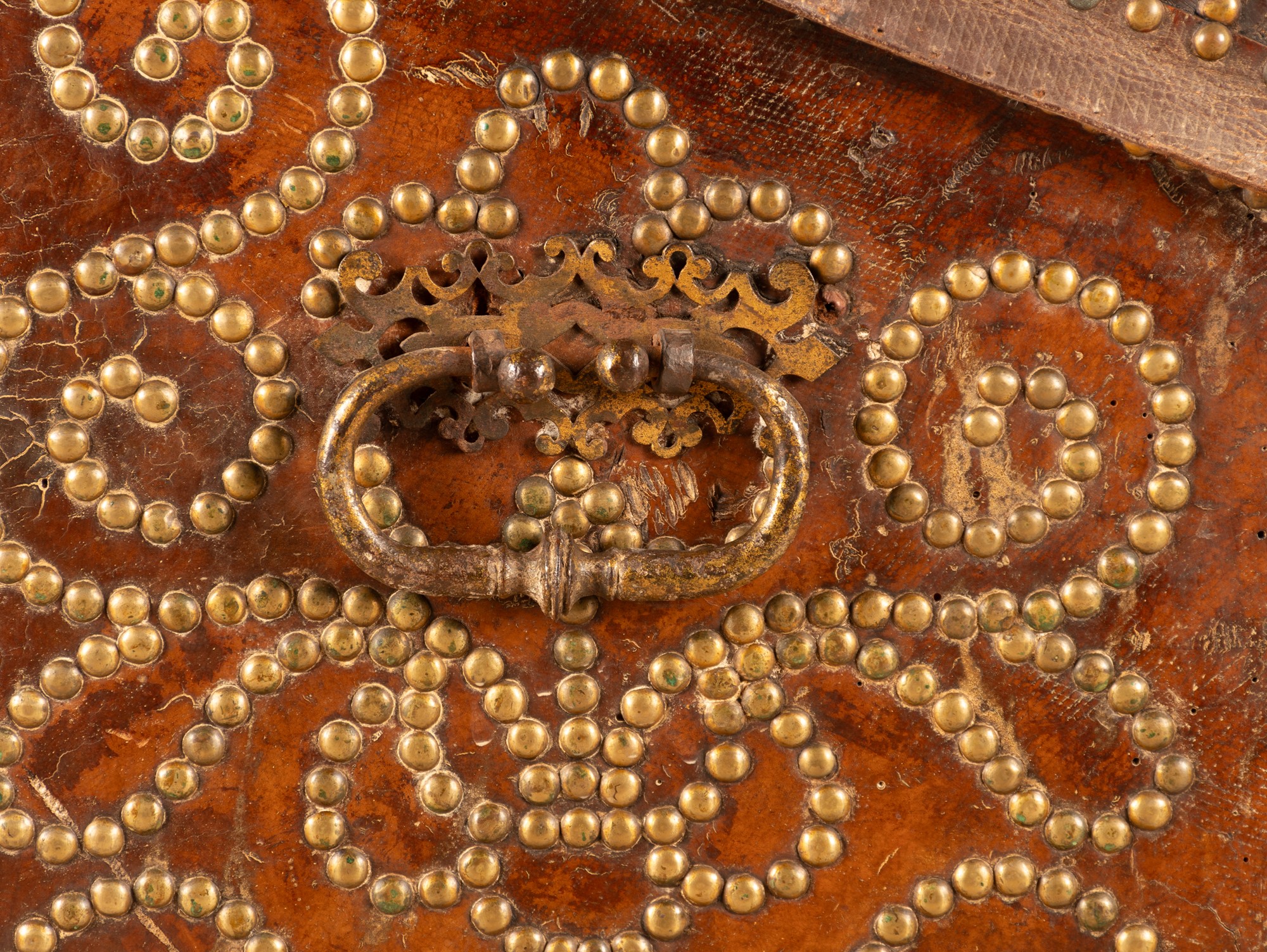 Coppia di bauli da viaggio con piano arcuto. Foderati in cuoio e decorati con borchie in ottone disposte a ricche volute. Manifattura spagnola del XVII secolo