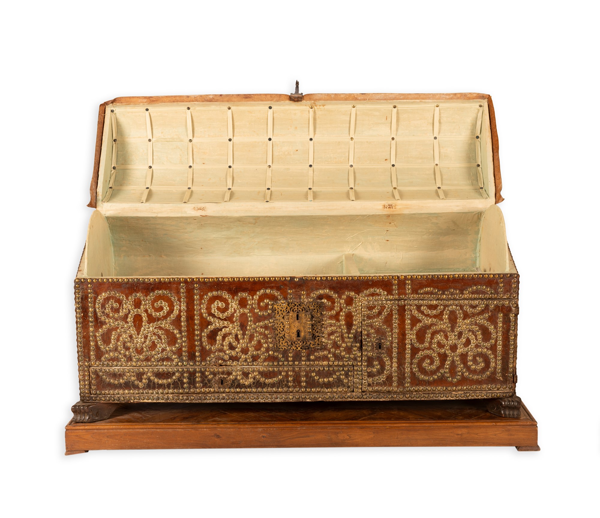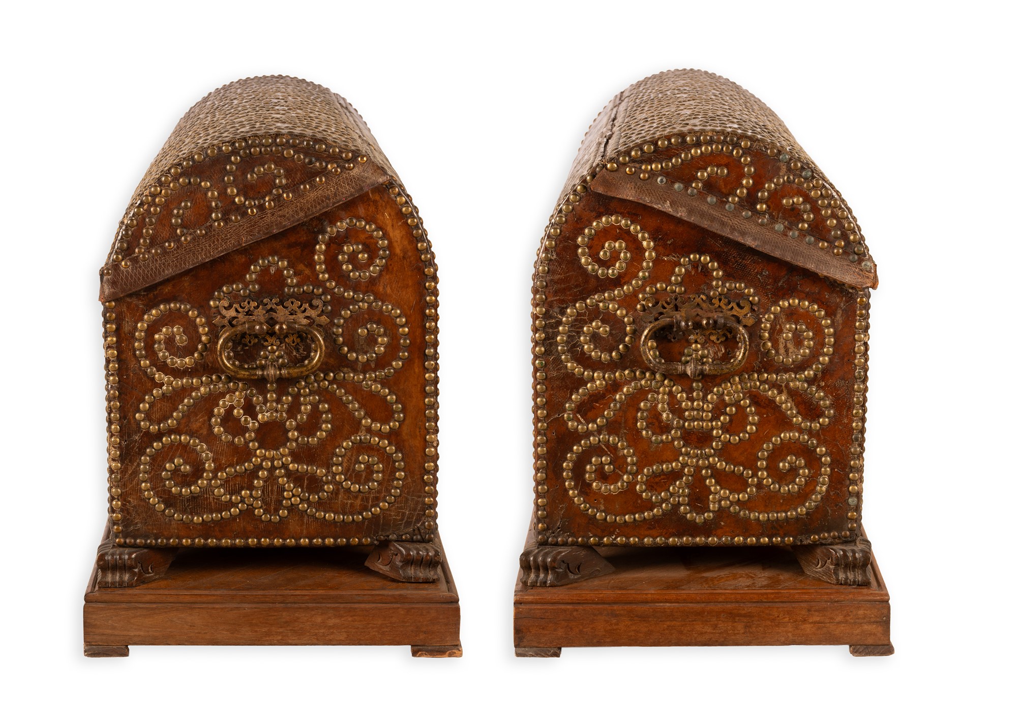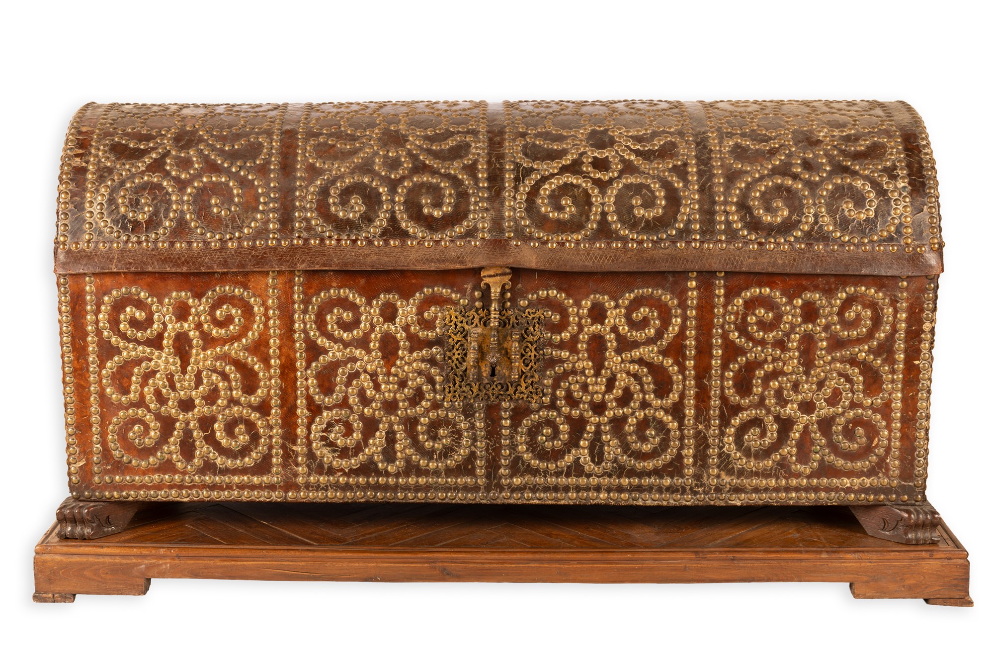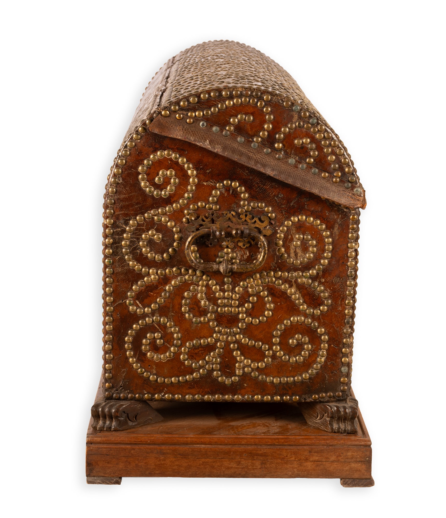 Coppia di bauli da viaggio con piano arcuto. Foderati in cuoio e decorati con borchie in ottone disposte a ricche volute. Manifattura spagnola del XVII secolo