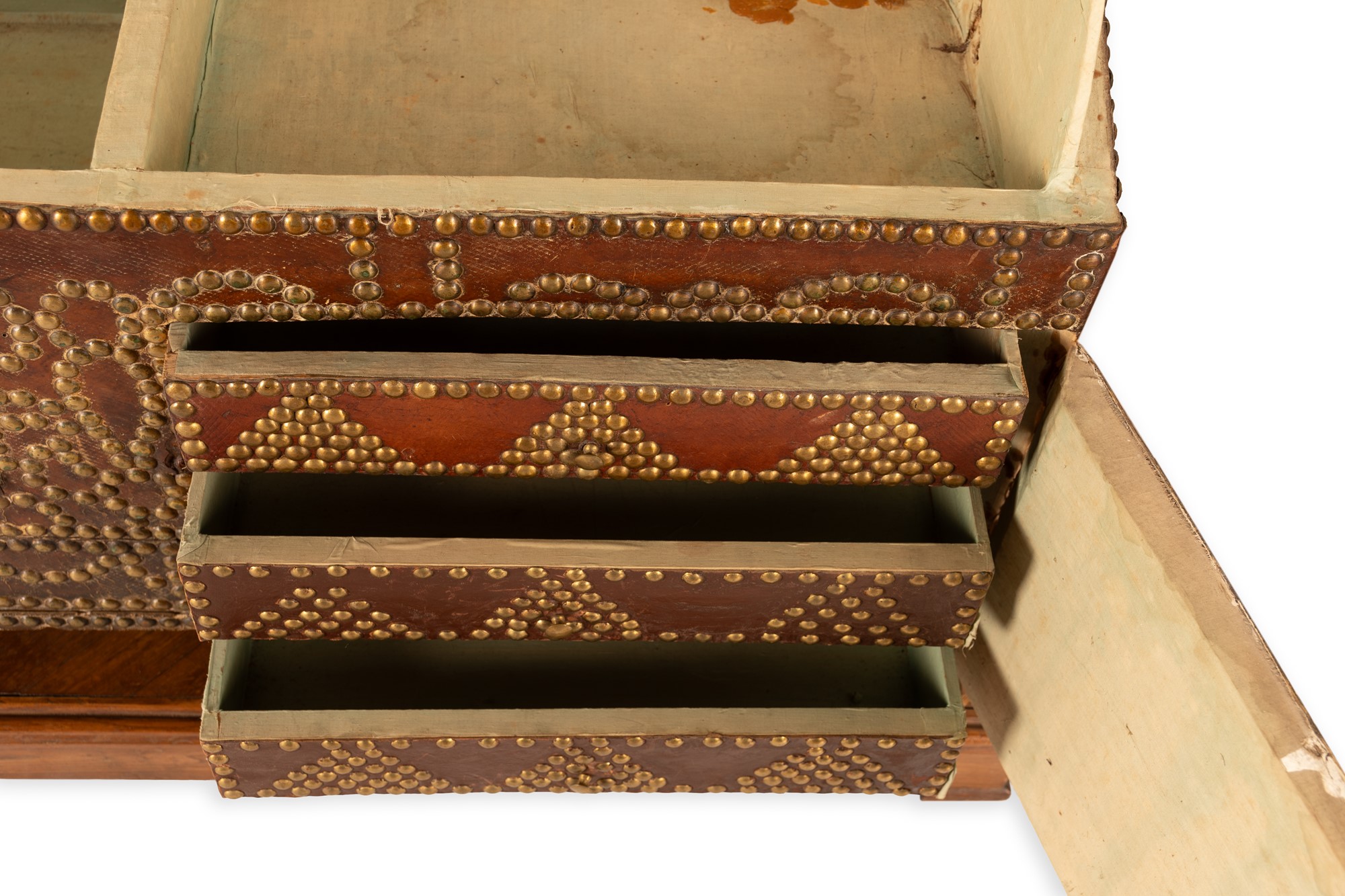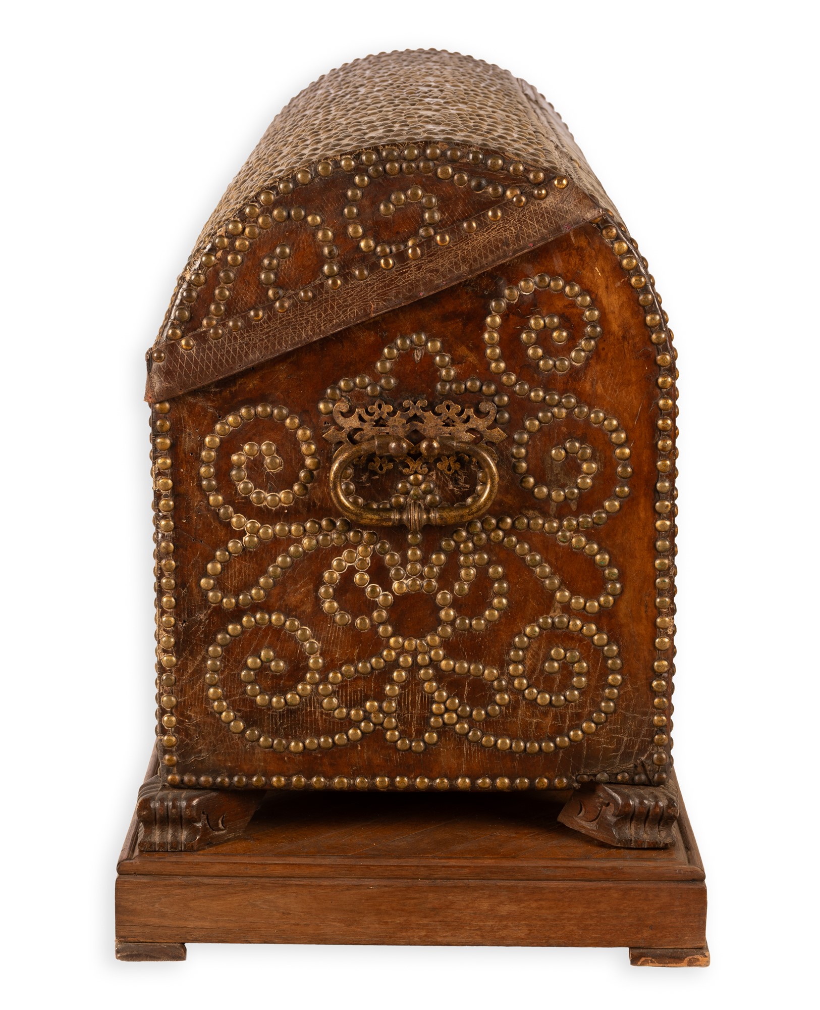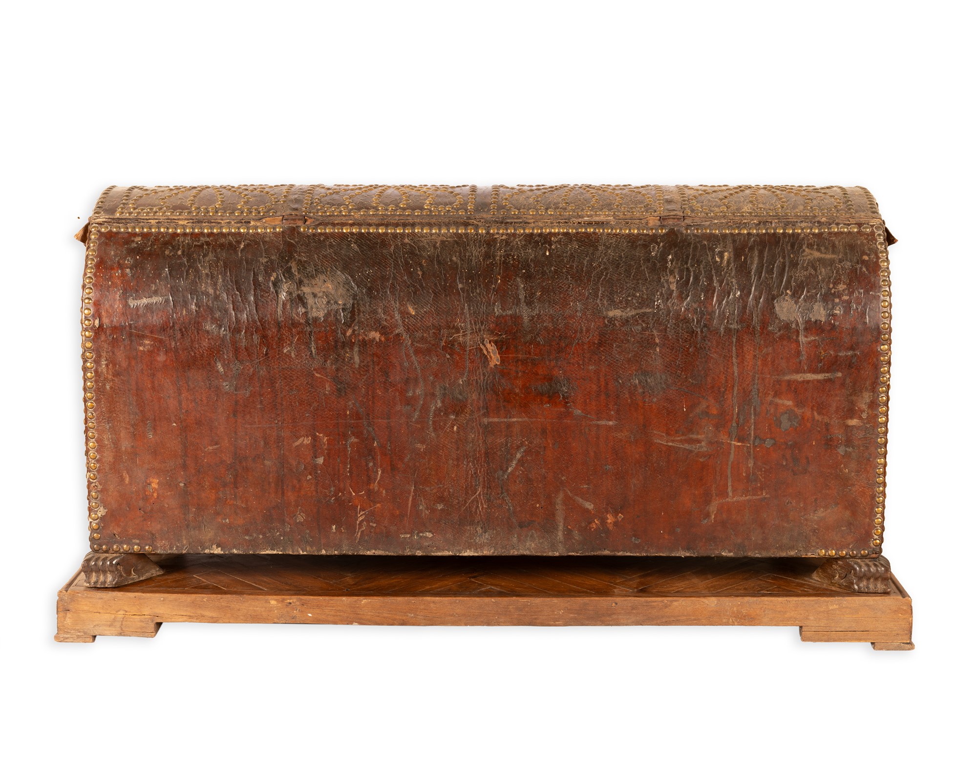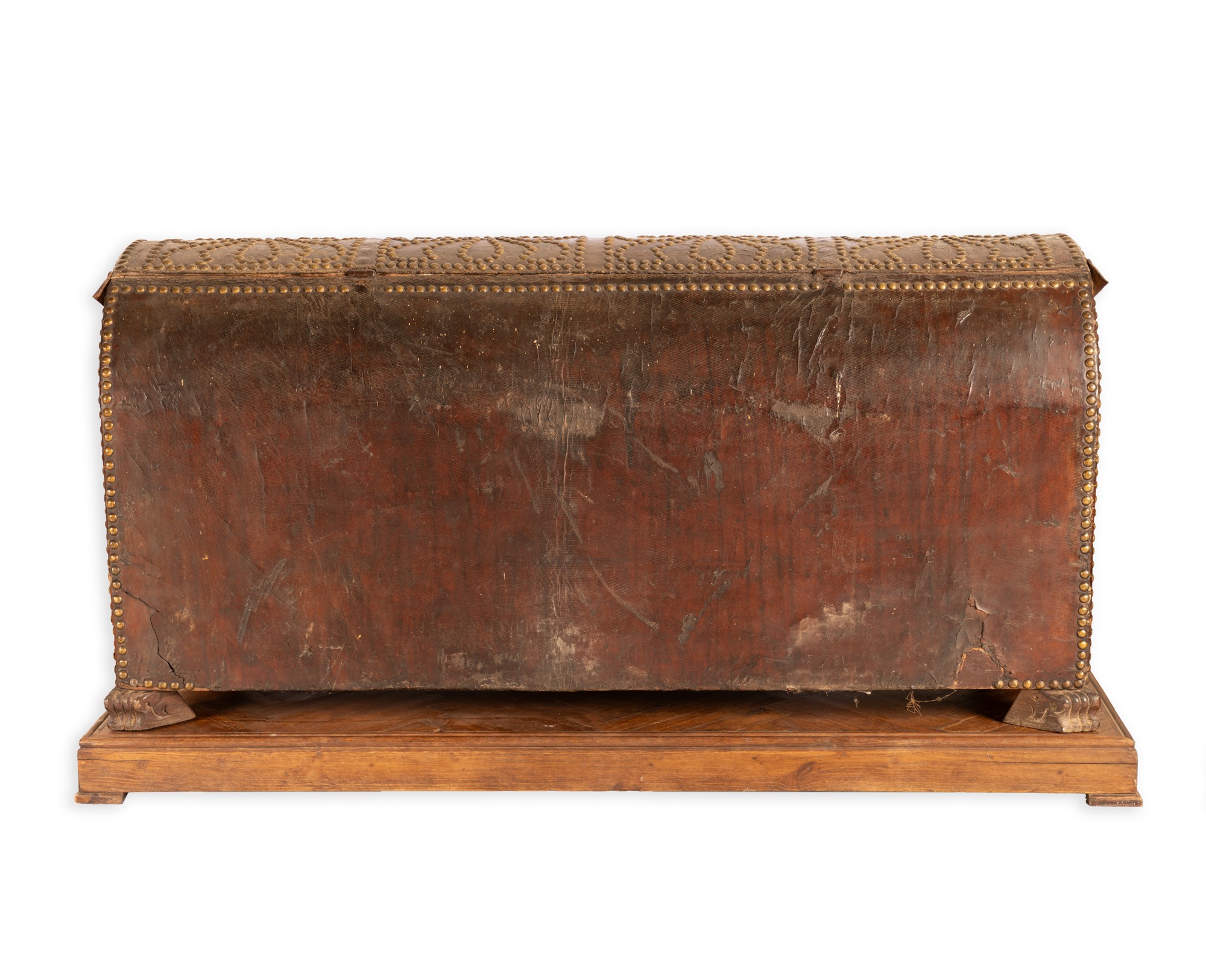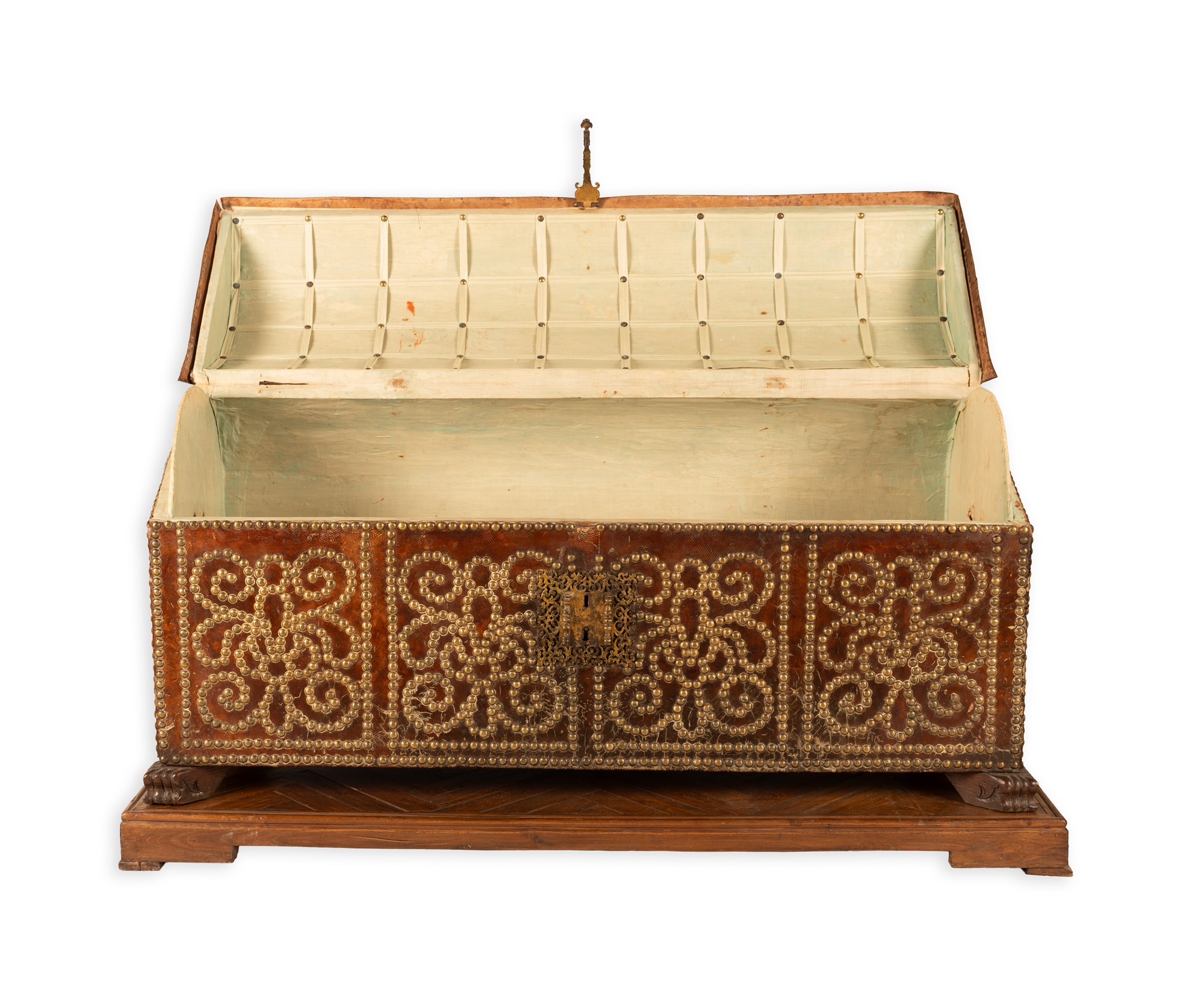 Coppia di bauli da viaggio con piano arcuto. Foderati in cuoio e decorati con borchie in ottone disposte a ricche volute. Manifattura spagnola del XVII secolo