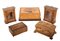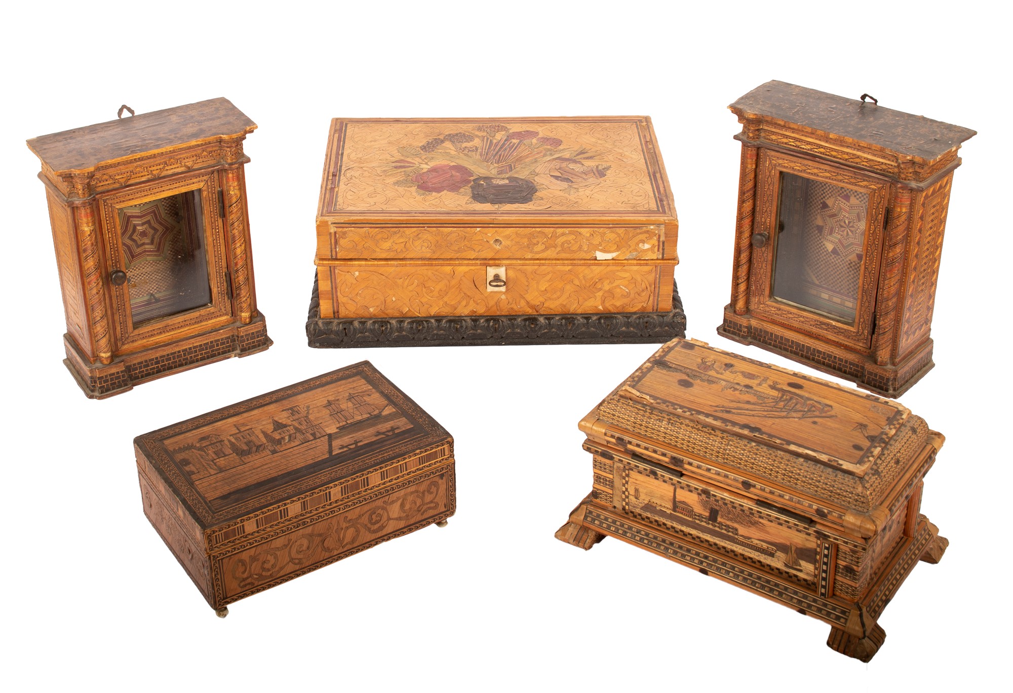 Lotto di 5 oggetti decorati con fili di paglia colorati. Manifattura del Centro Italia del XIX secolo. composto da: