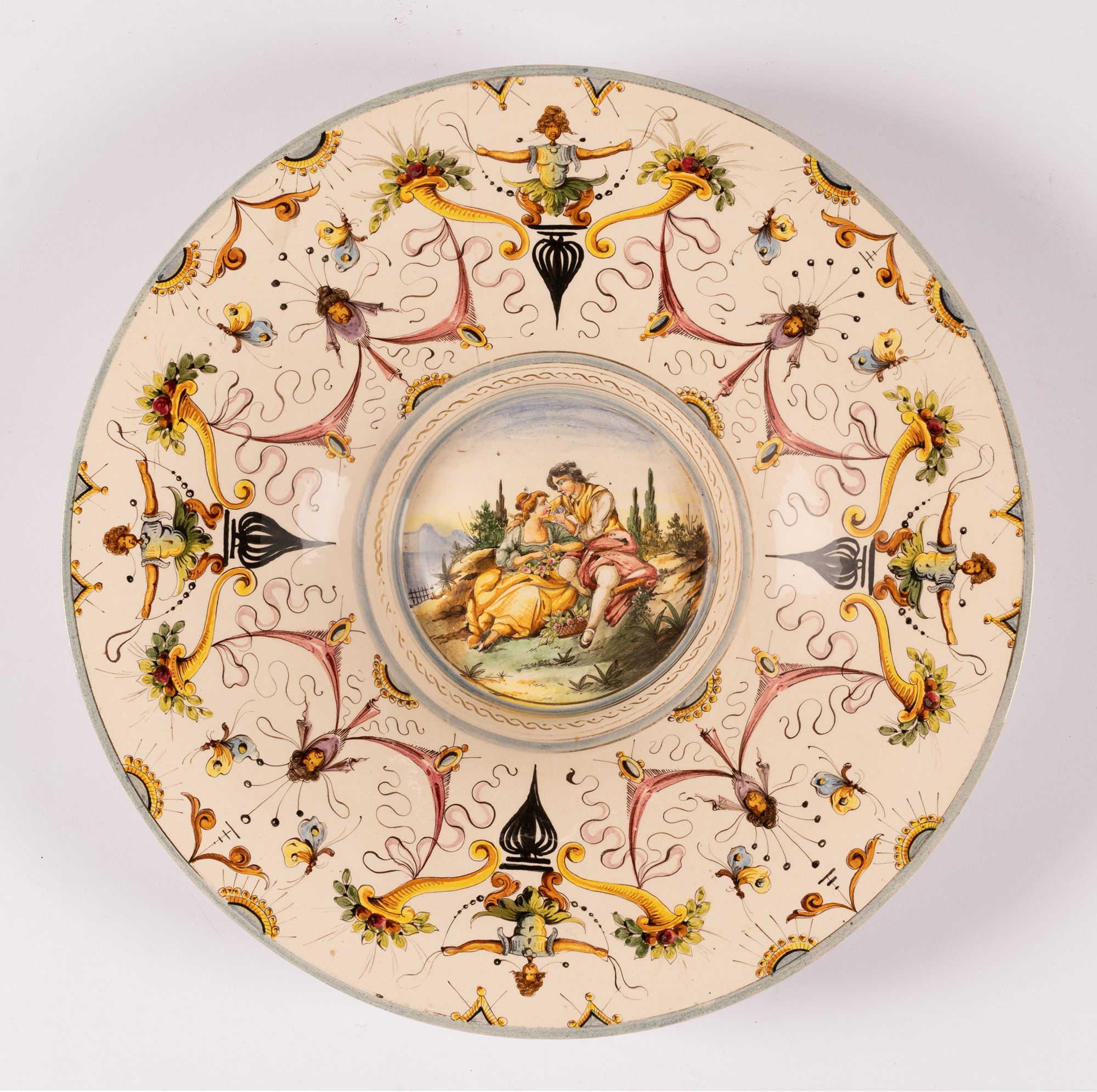 Grande piatto in maiolica con larga tesa decorata con motivi a raffaellesche di gusto neorinascimentale. Manifattura A. Ciulli, inizi del XX secolo.