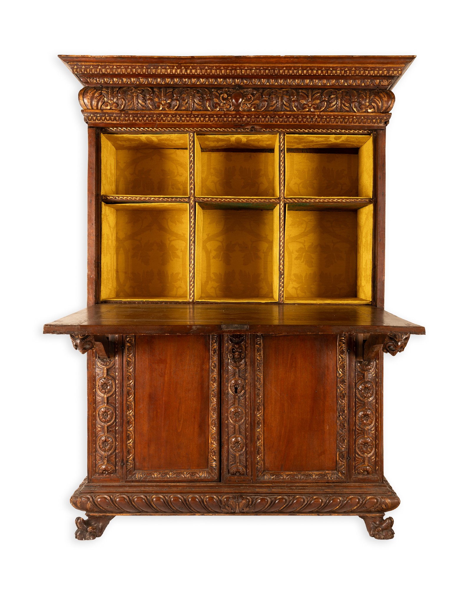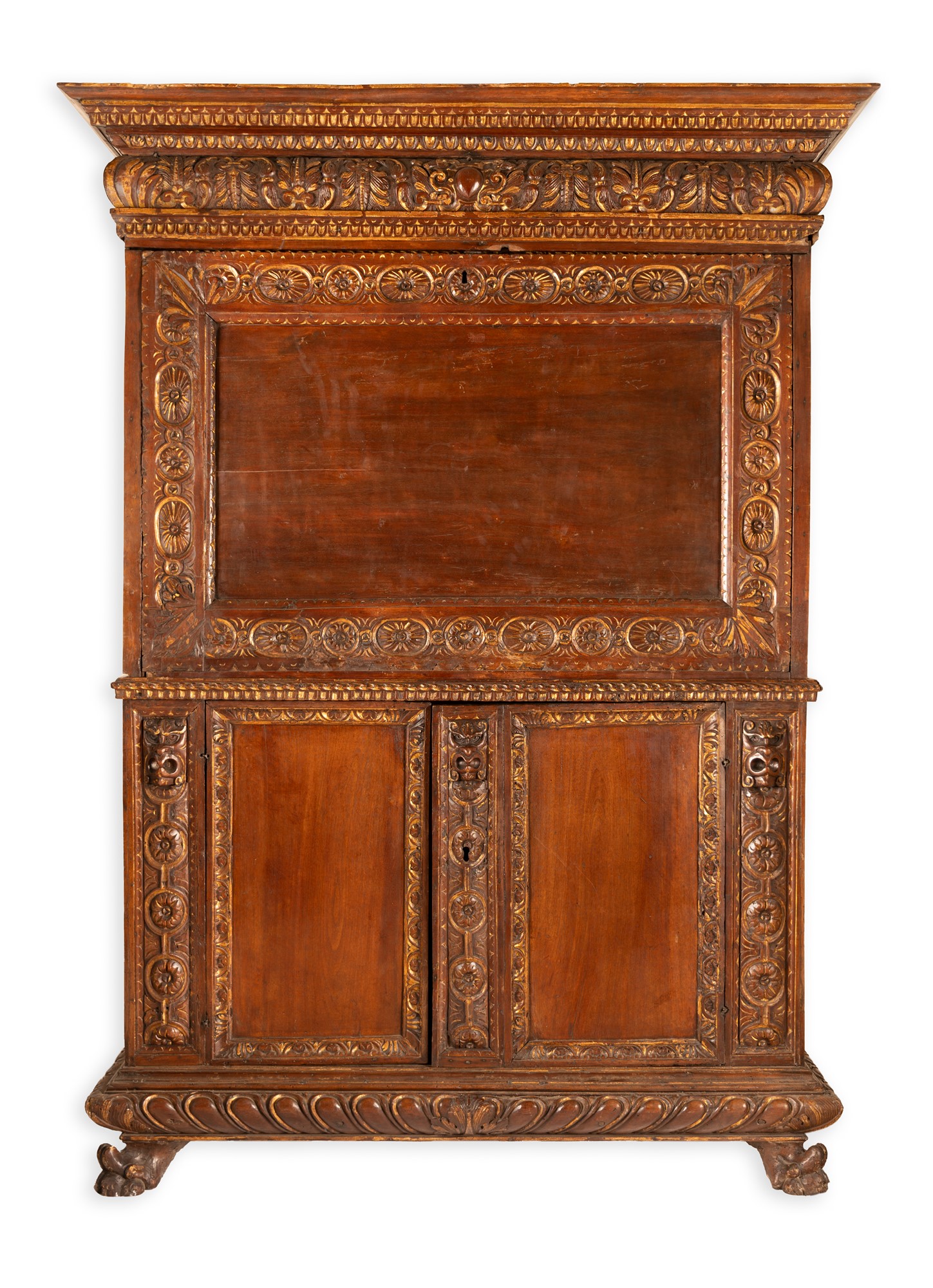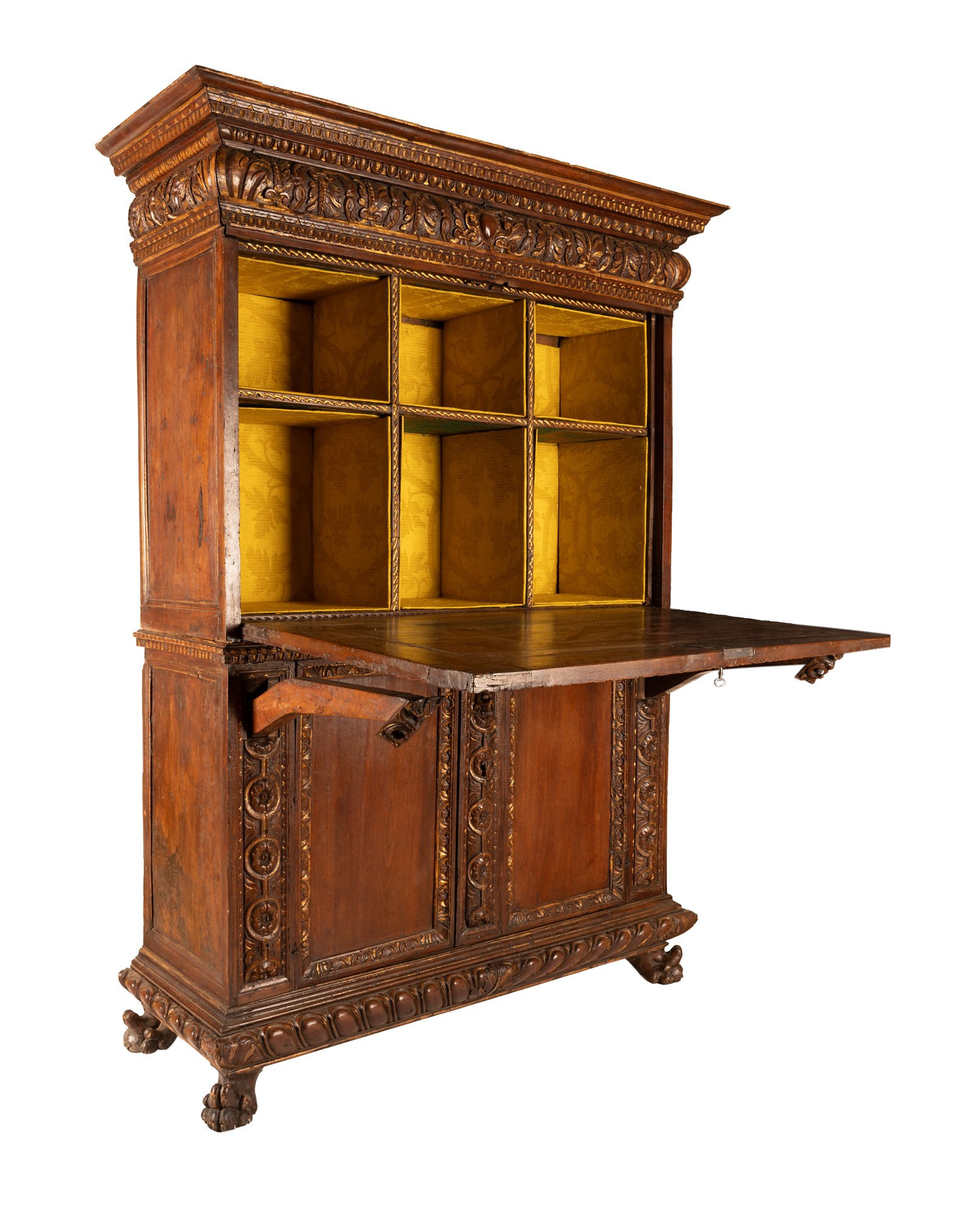 Grande mobile scrittoio in noce con ricco intaglio e lumeggiature in oro. Toscana, seconda metà del XVI secolo