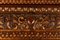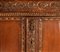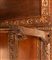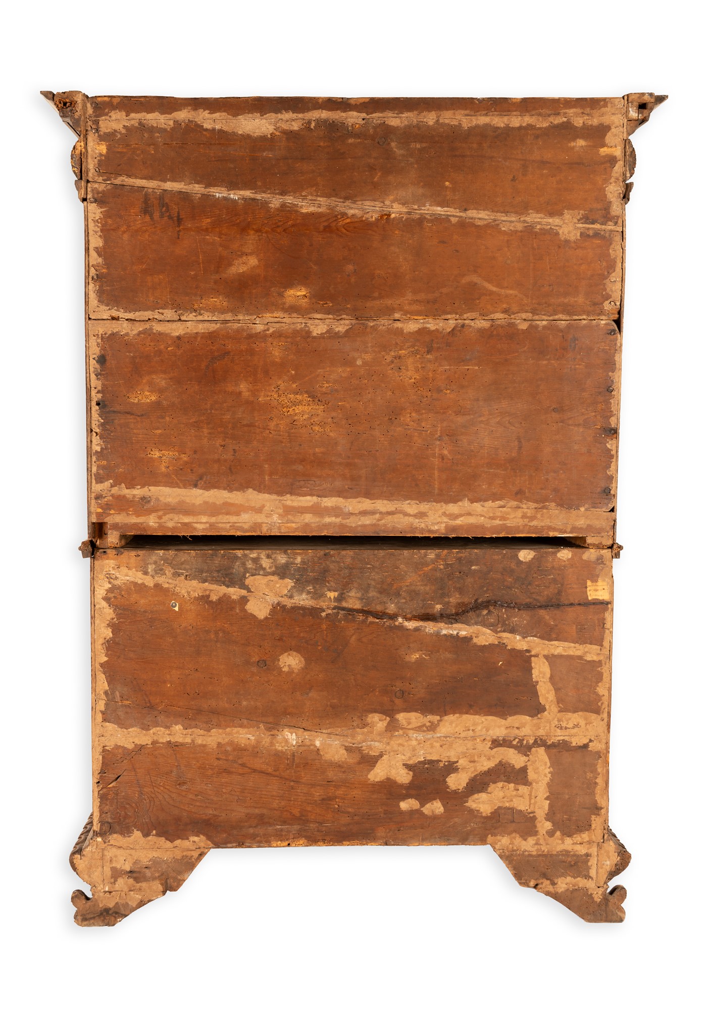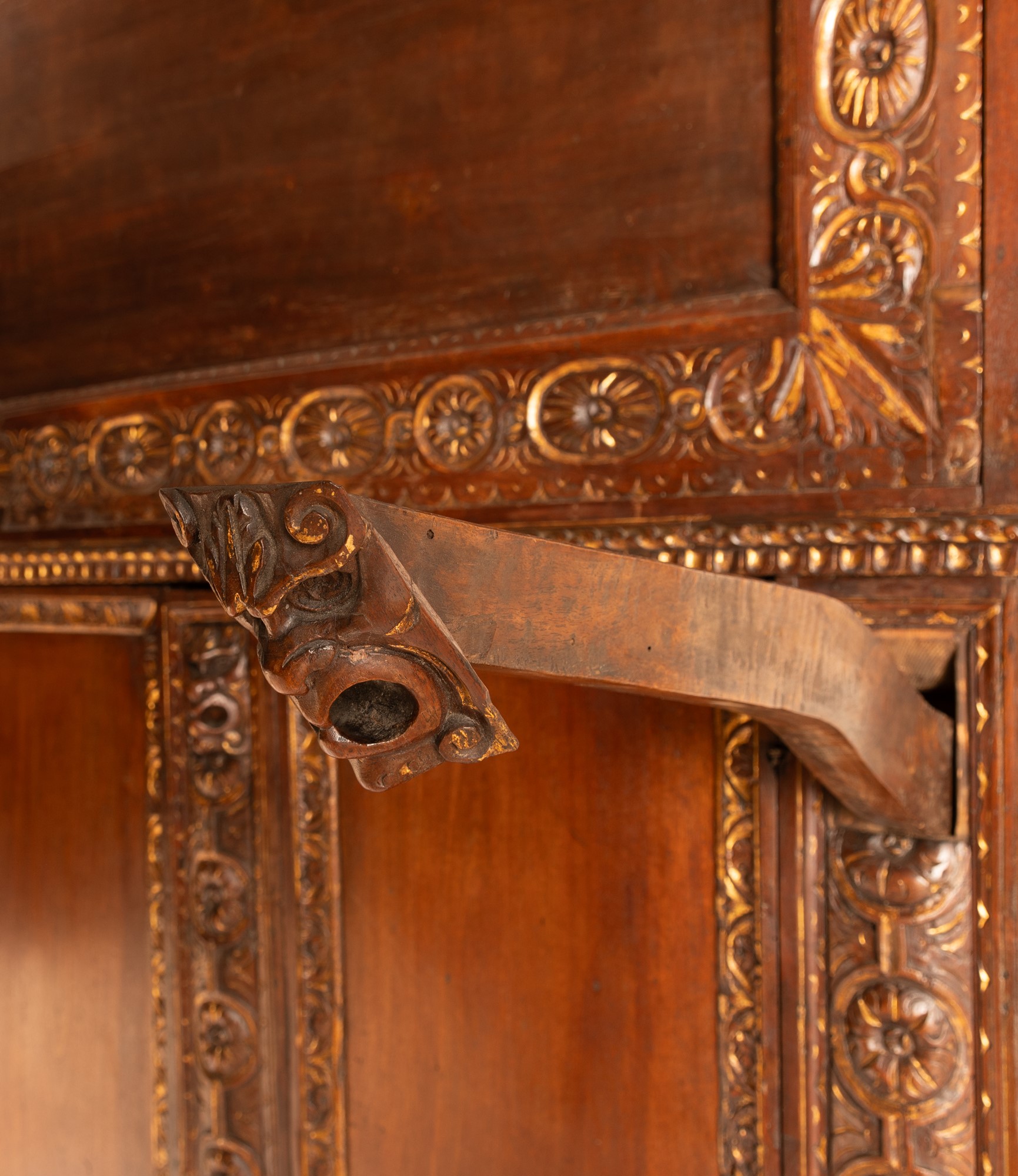 Cappello modanato sorretto da fascia a più ordini di intaglio lumeggiati in oro, l'ultimo dei quali, bombato a tulipano, cela ampio segreto che corre per tutta la larghezza del mobile.