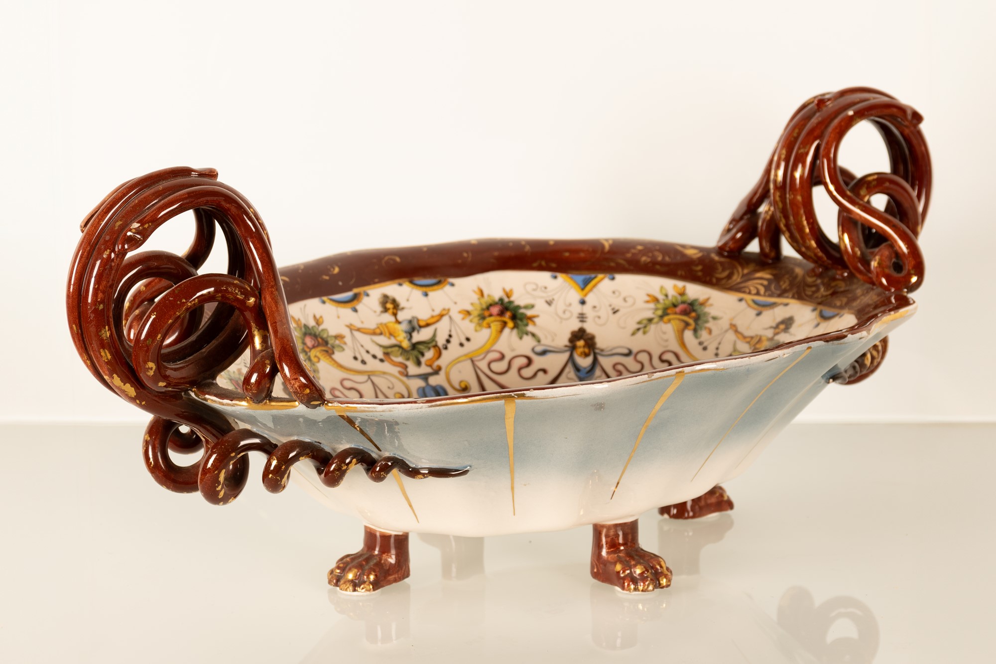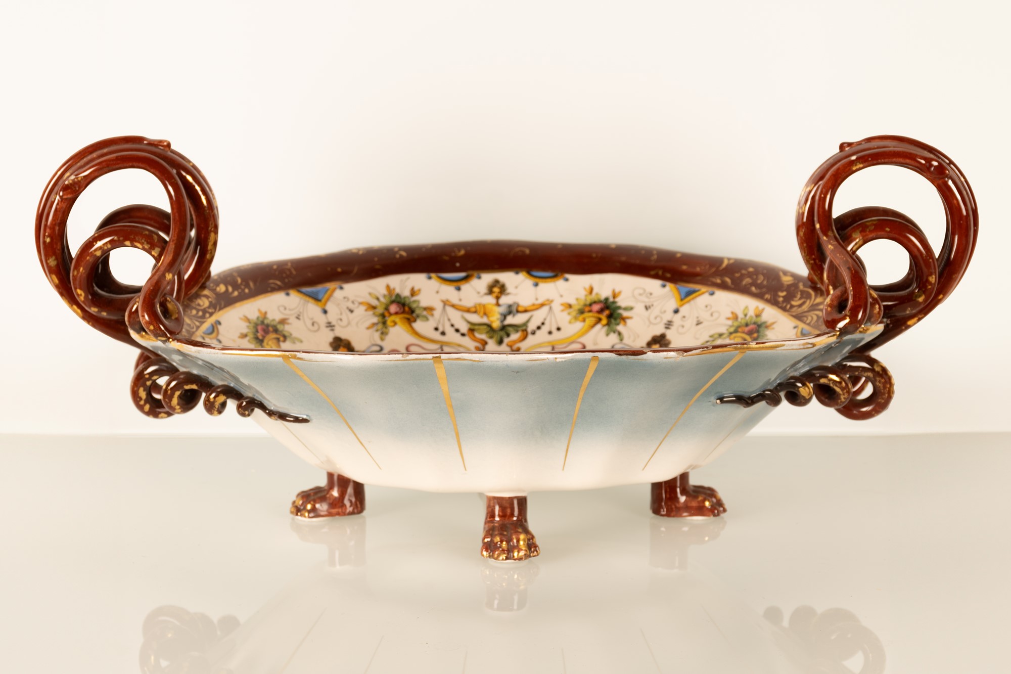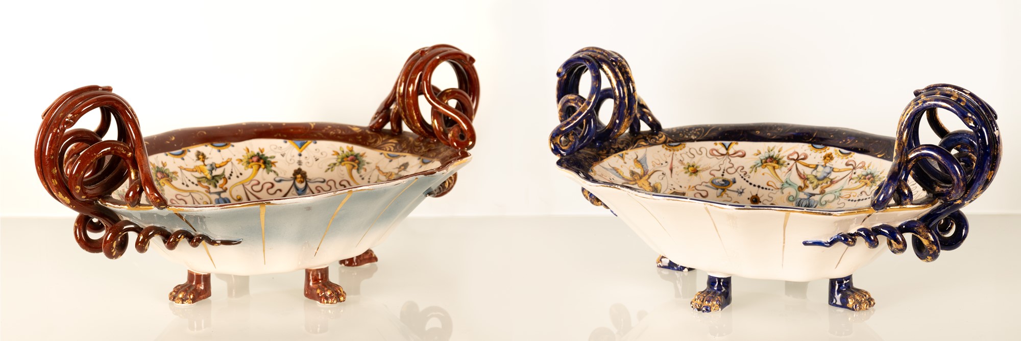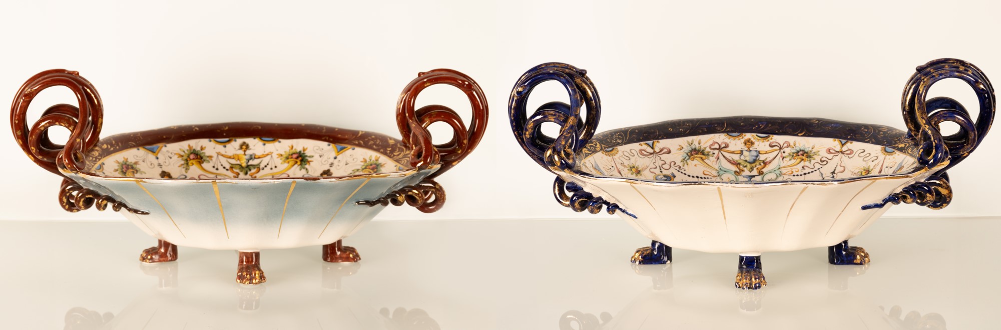 Coppia di centrotavola in maiolica con anse serpentiformi e zampe leonine. Manifattura A. Ciulli, inizi del XX secolo.