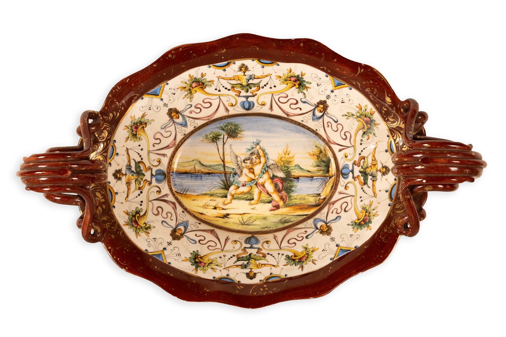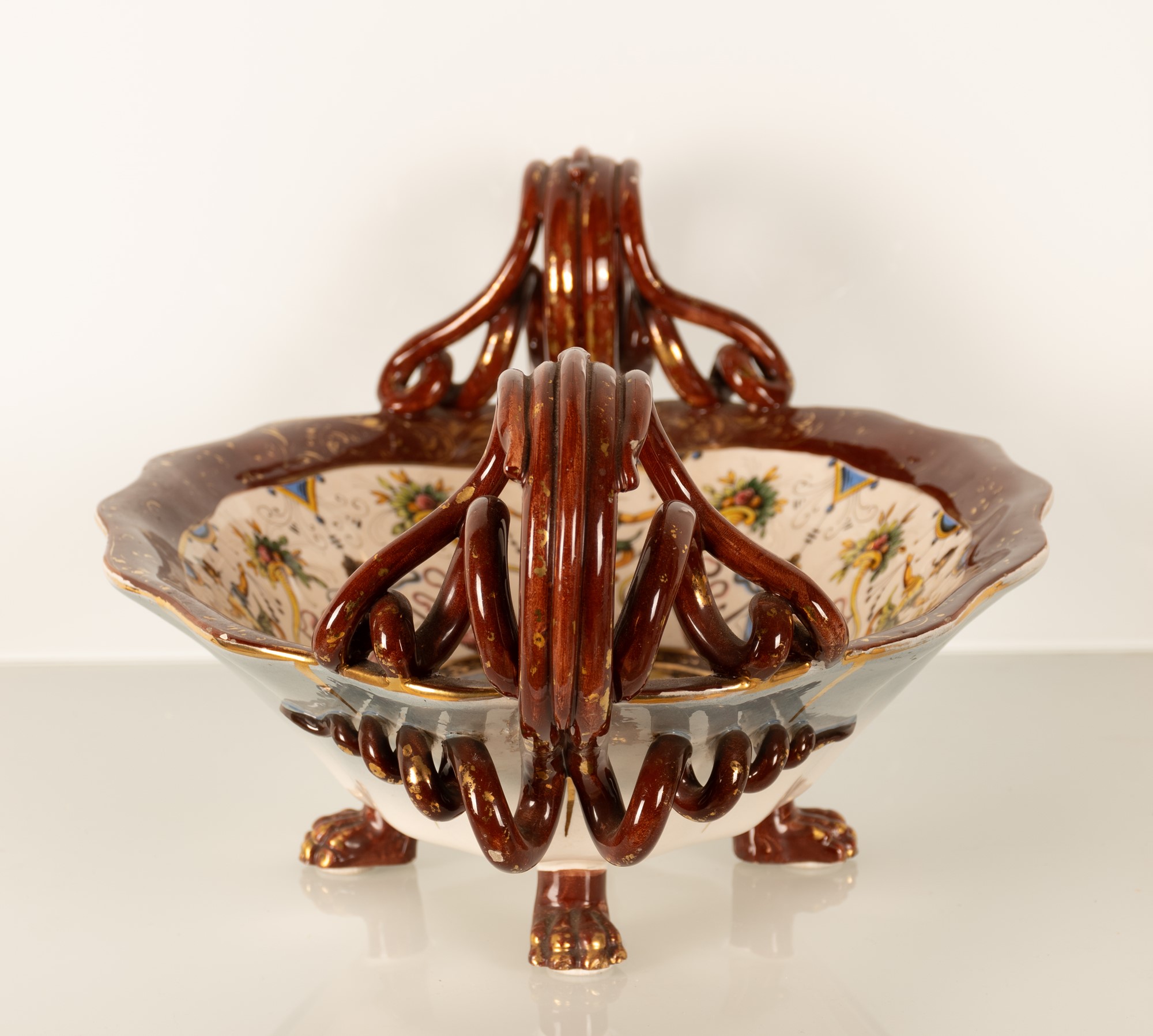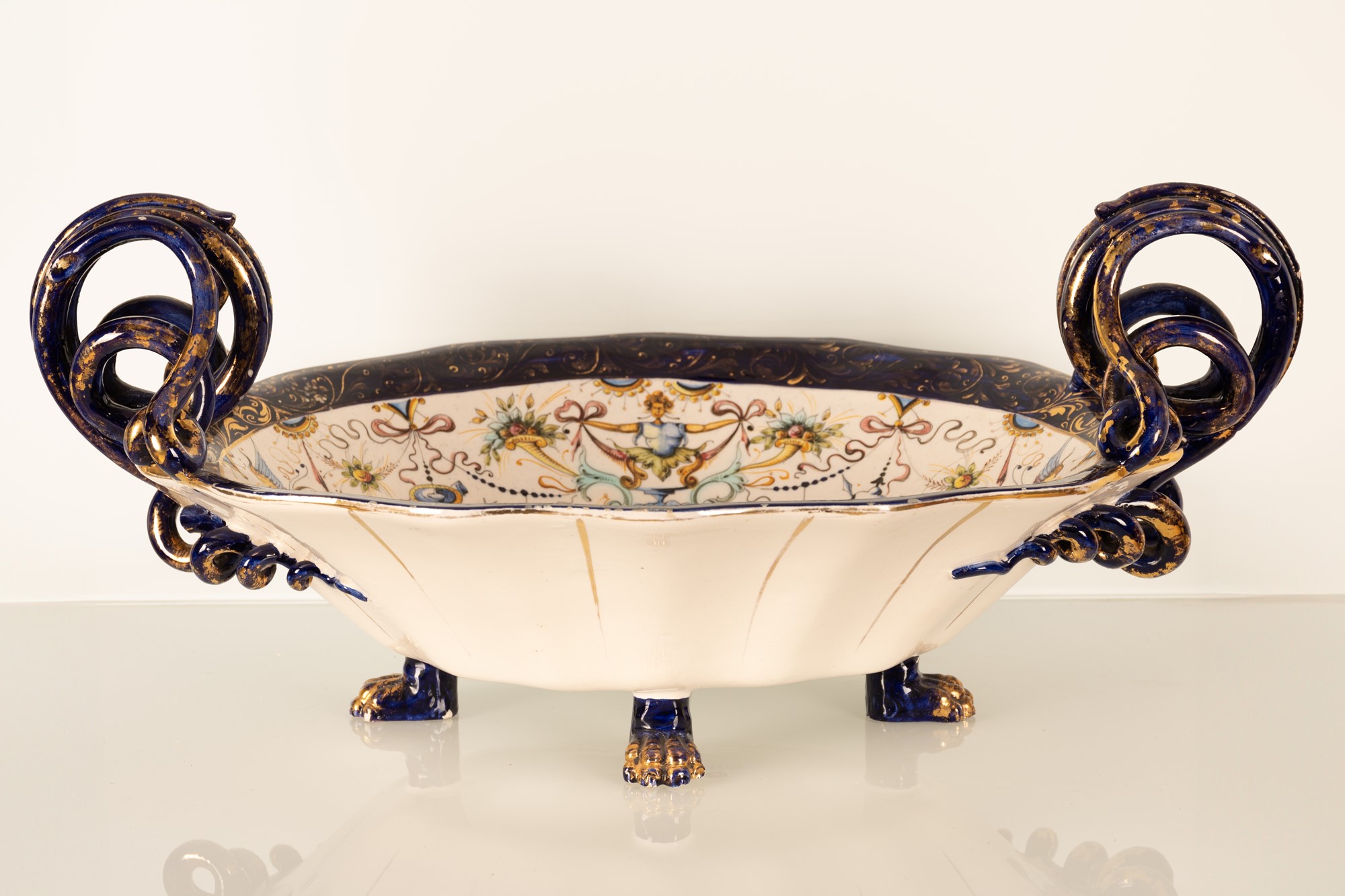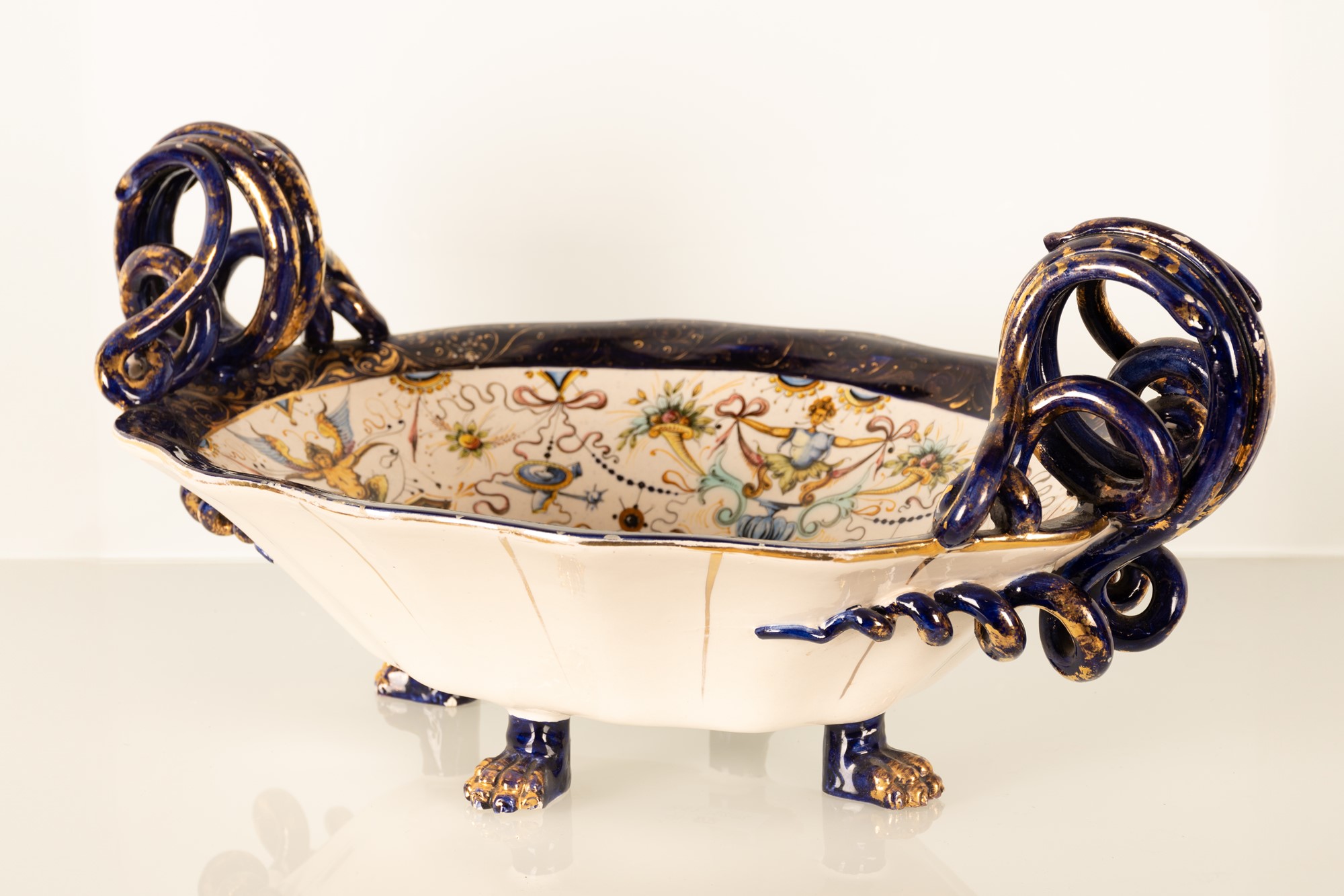 Coppia di centrotavola in maiolica con anse serpentiformi e zampe leonine. Manifattura A. Ciulli, inizi del XX secolo.