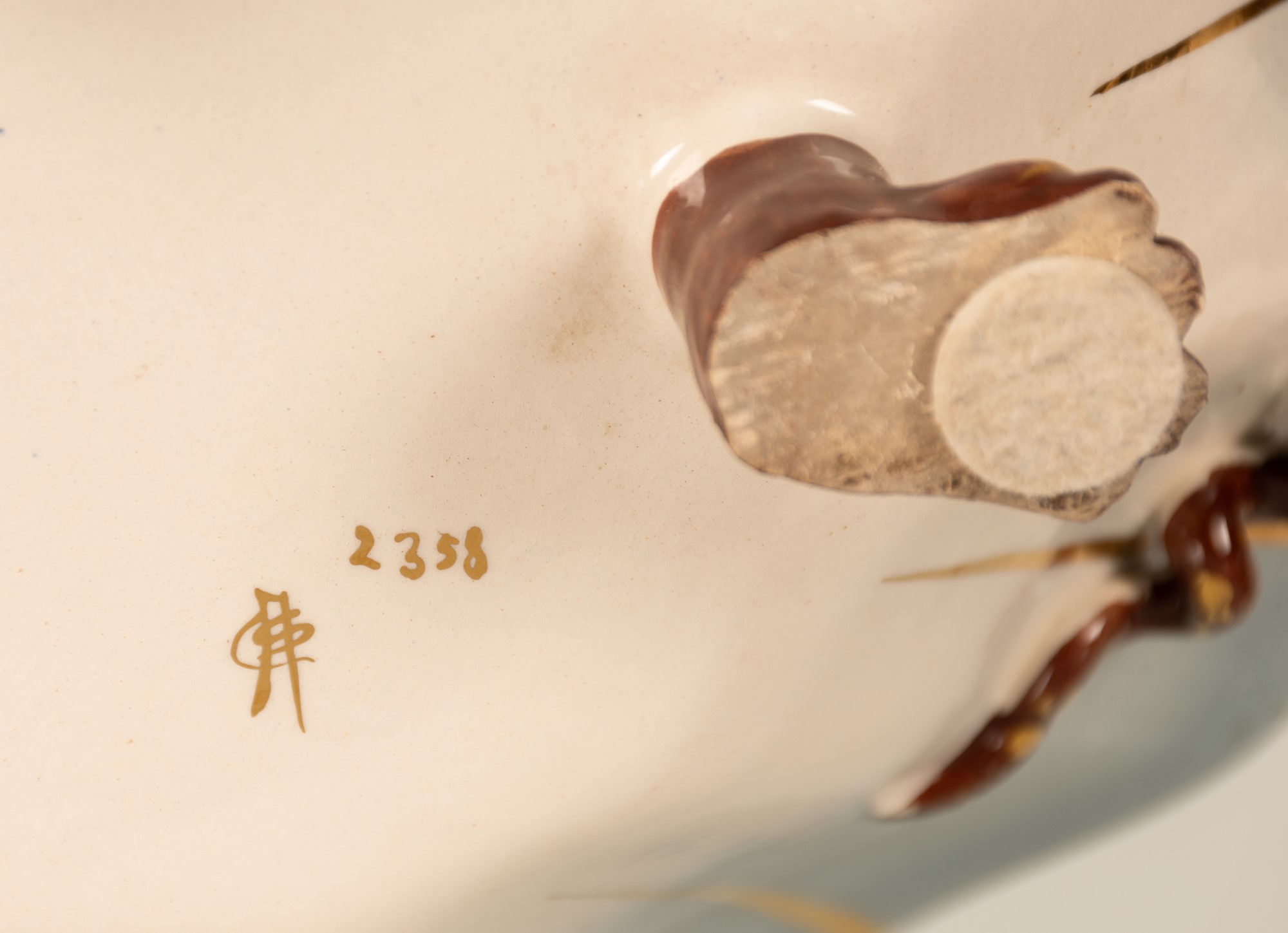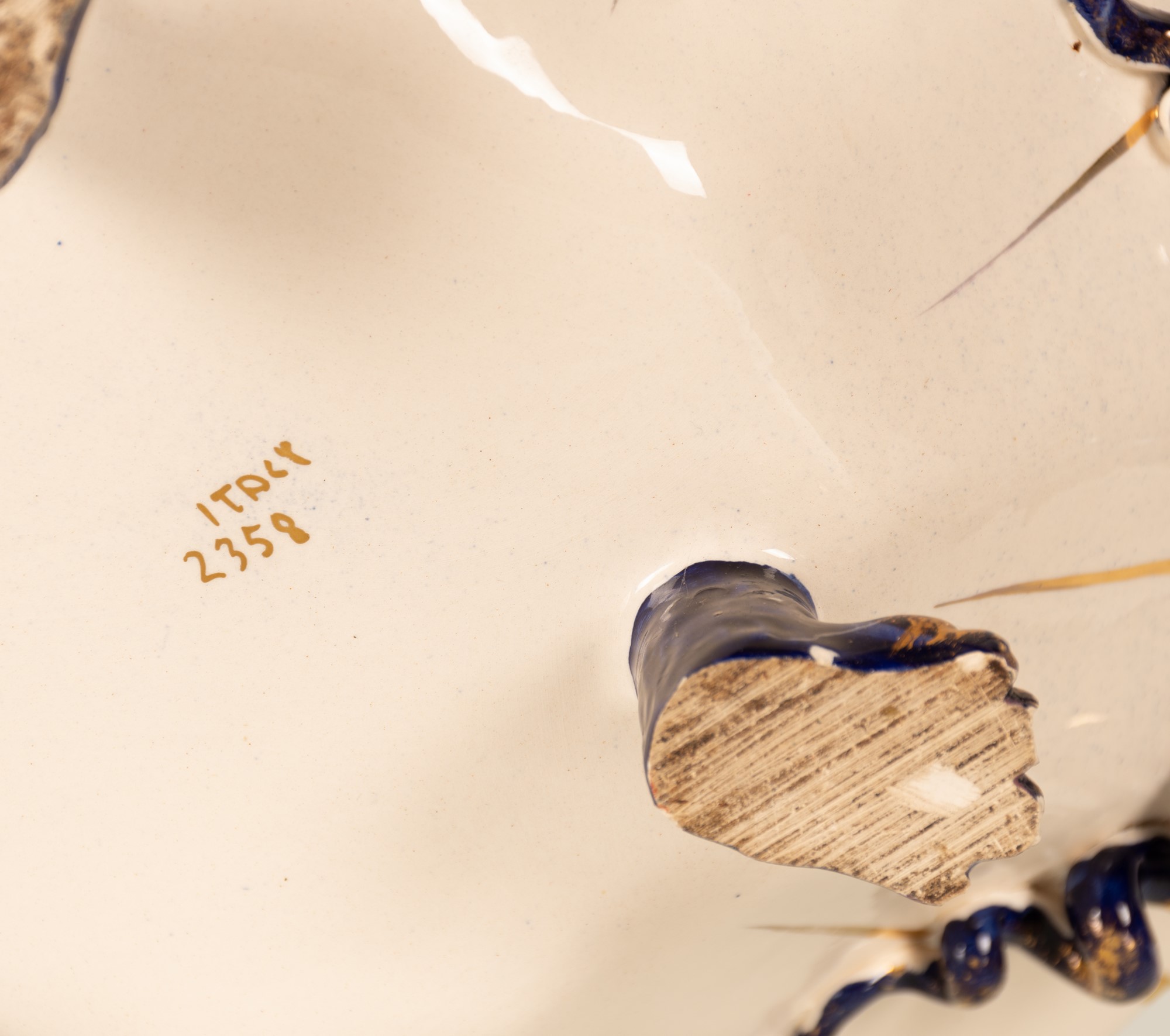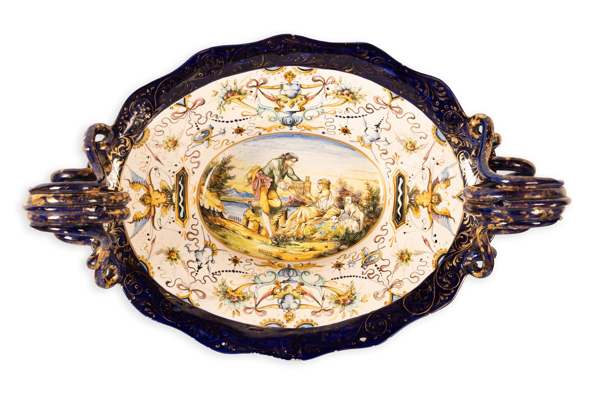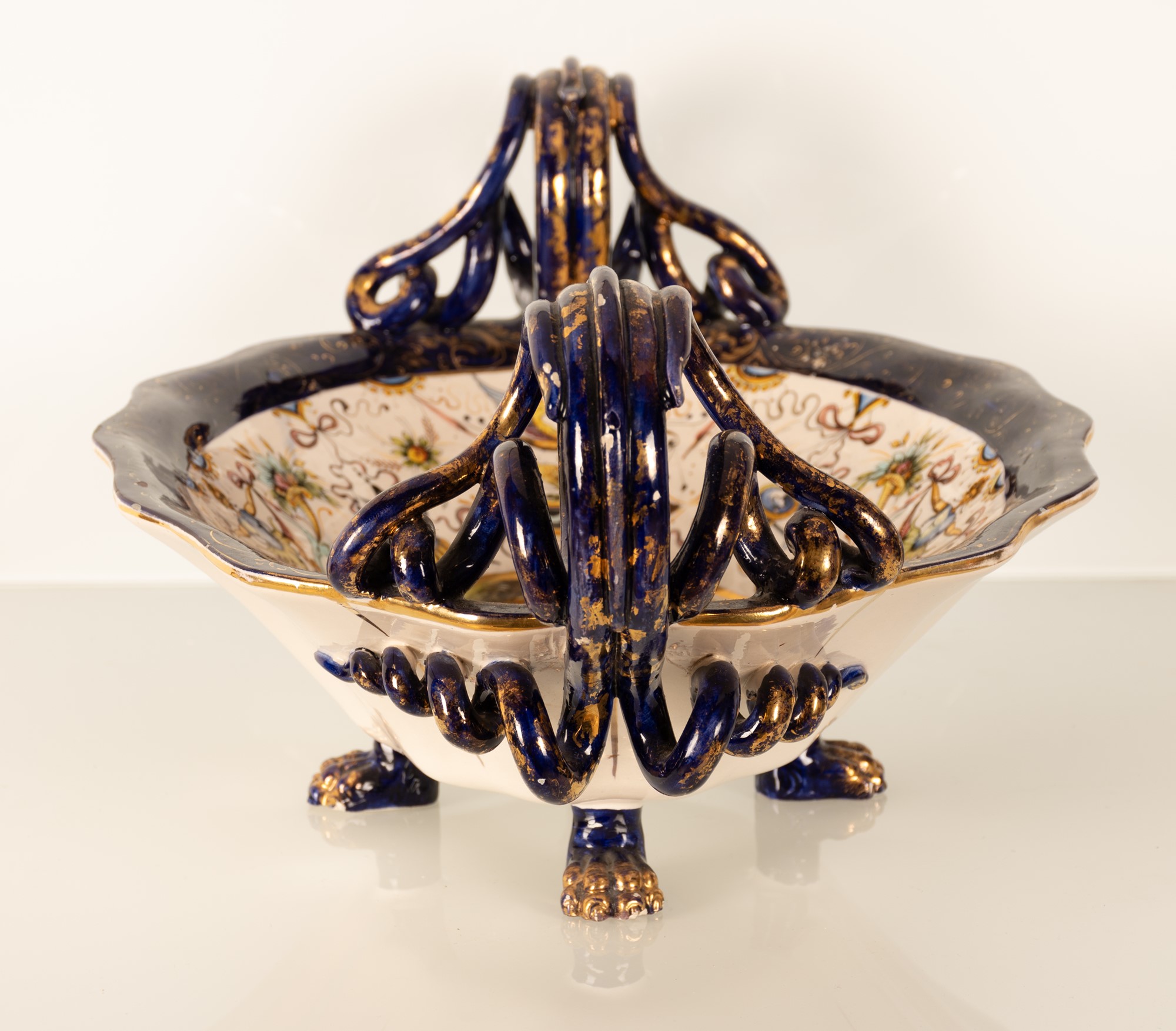 Coppia di centrotavola in maiolica con anse serpentiformi e zampe leonine. Manifattura A. Ciulli, inizi del XX secolo.