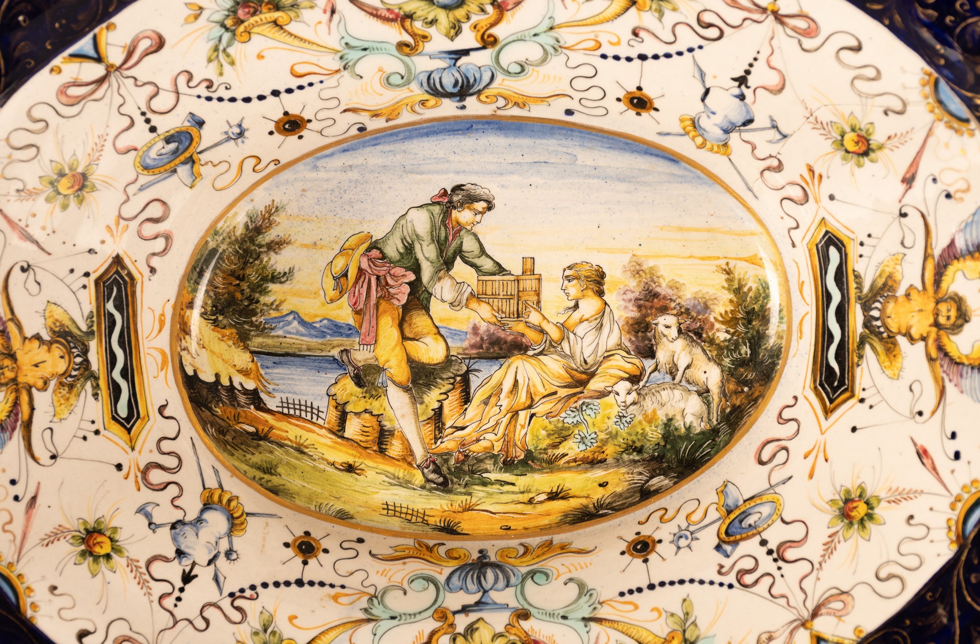 Il decoro è di gusto rinascimentale e sulla tesa sono presenti raffaellesche, mentre al centro del cavo una scena galante tratta da un dipinto di Francois Boucher. Il decoro nell'insieme riprende le forme e gli stilemi della maiolica metaurense del primo '600.