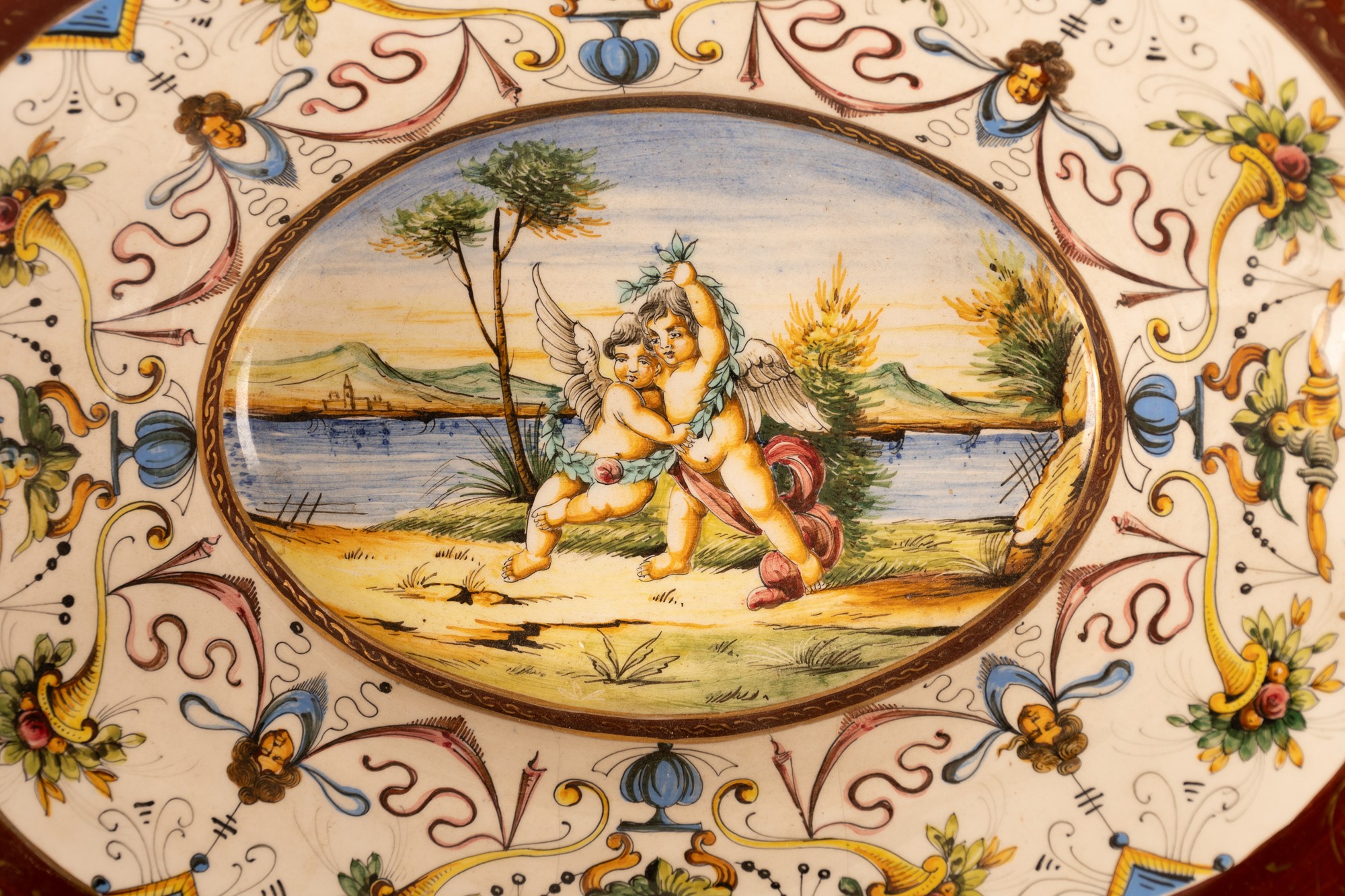 Il decoro è di gusto rinascimentale e sulla tesa sono presenti raffaellesche, mentre al centro del cavo un gioco di putti. Il decoro nell'insieme riprende le forme e gli stilemi della maiolica metaurense del primo '600.