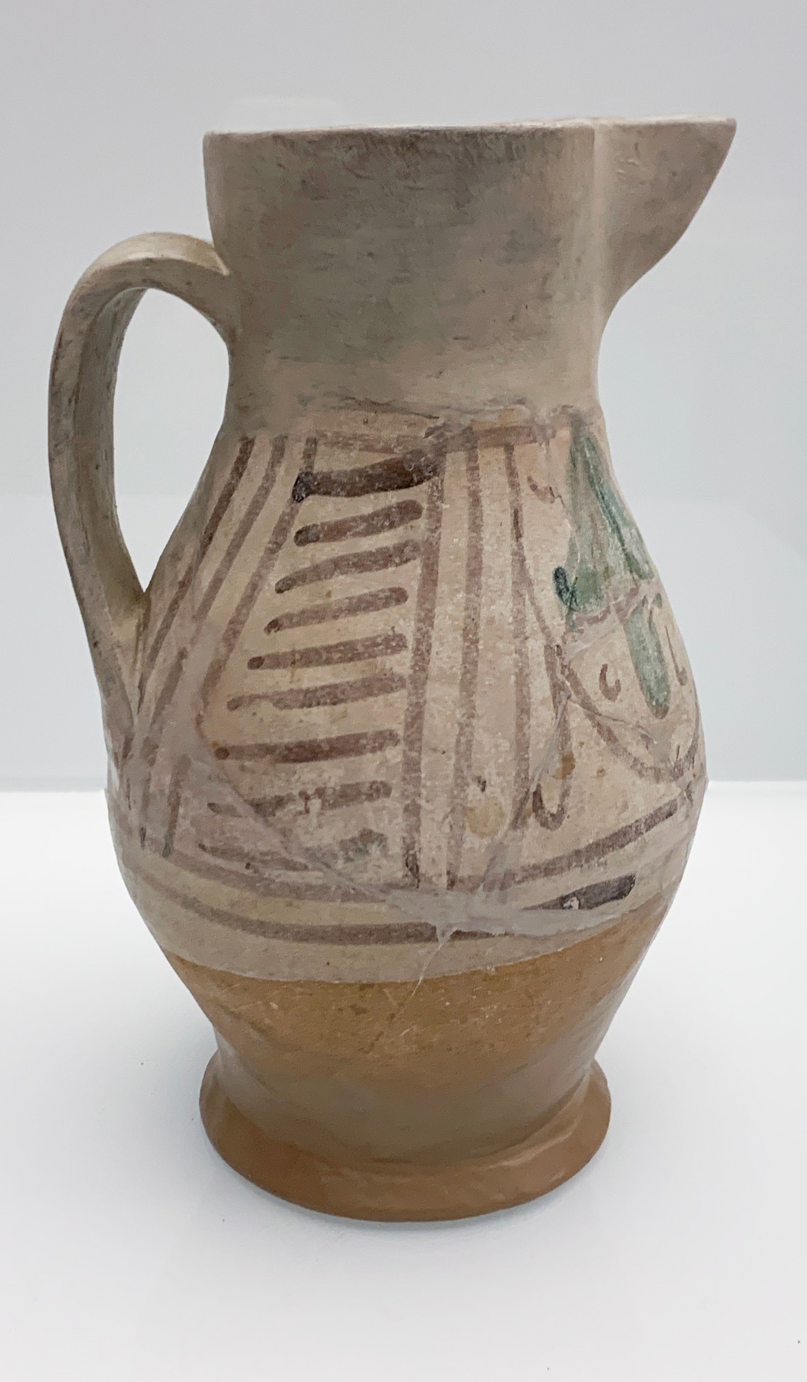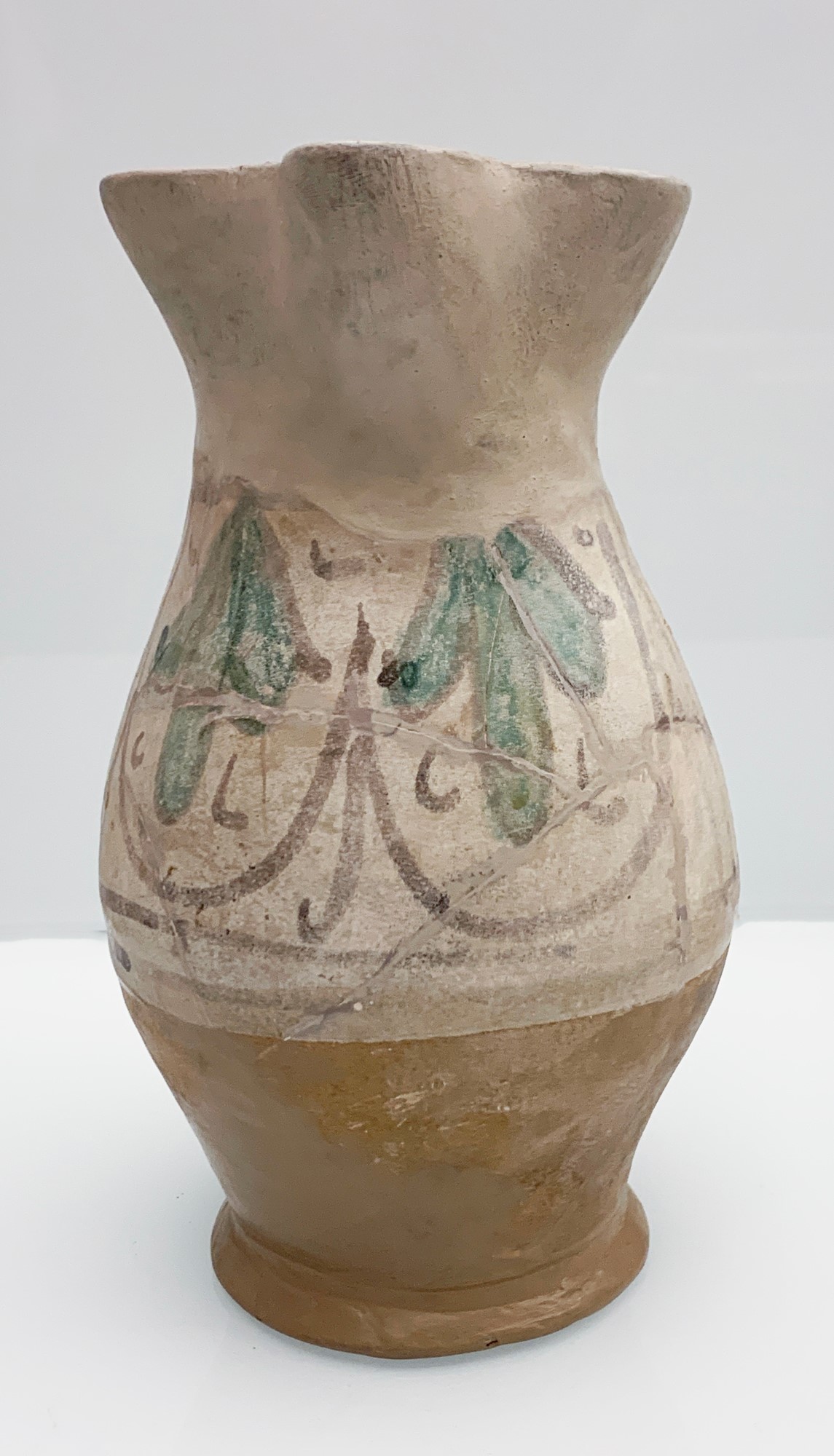 Boccale in maiolica arcaica dal corpo piriforme. Manifattura senese (Montalcino) dell'ultima metà del XV secolo