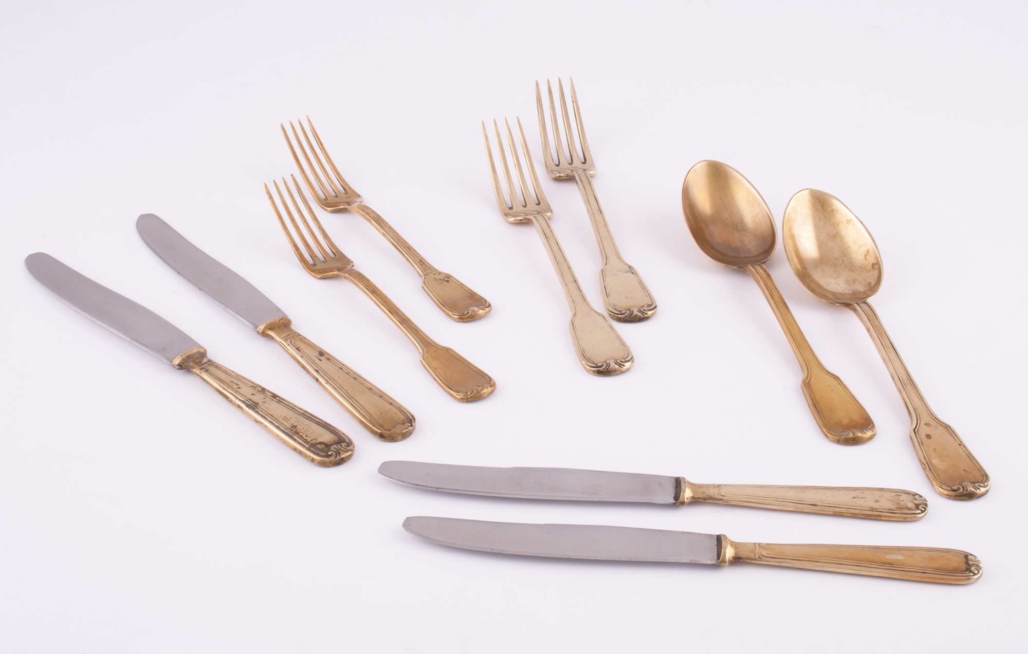 peso al netto dei coltelli: g 1086 Servizio composto da 6 cucchiai, 6 forchette, 6 forchettine da dolce, 6 coltelli, 6 coltelli da dolce