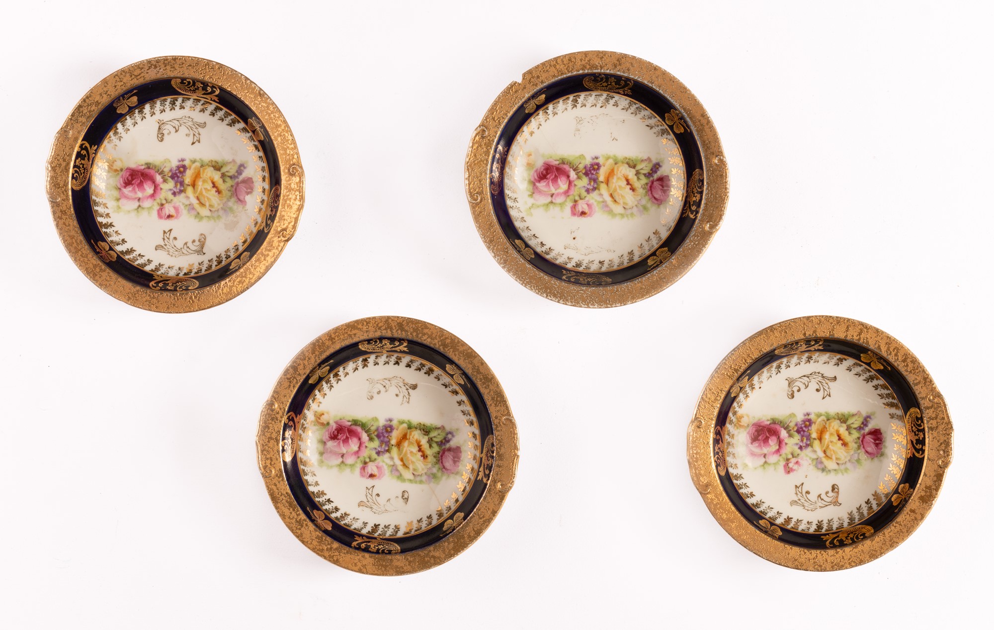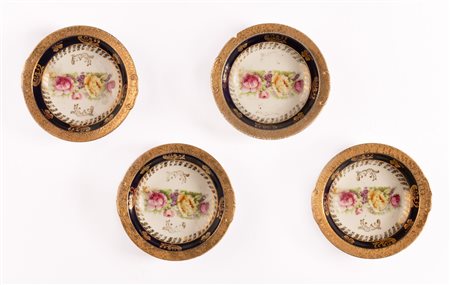 Lotto di quattro coppette in porcellana dipinta nella testa a fondo blu notte con decori oro e al cavetto con decoro floreale. Manifattura francese del XX secolo