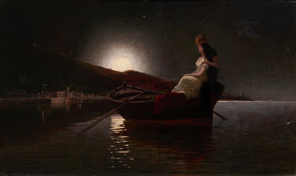 Ugo Manaresi "Amanti al chiaro di luna" olio su tavola (cm 26,5x44,5) firmato i
