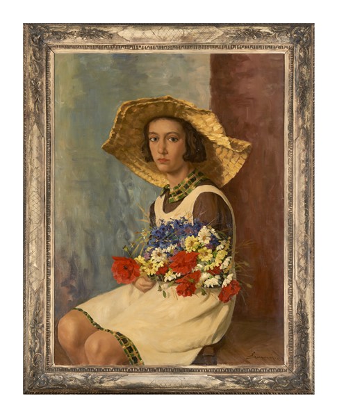 Annibale Scaroni "Liliana con fiori di campo" 1938 olio su tela (cm 100x74) firm