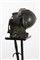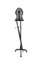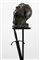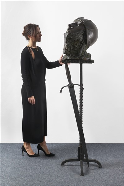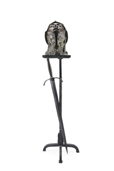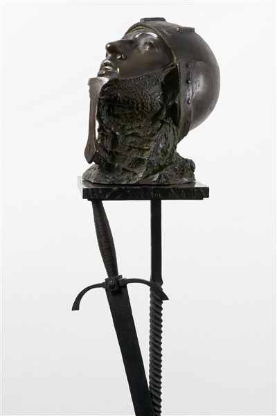 scultura in bronzo poggiante su sostegno in ferro battuto tornito decorato con finta spada (h. cm 128) (cm 48x51)