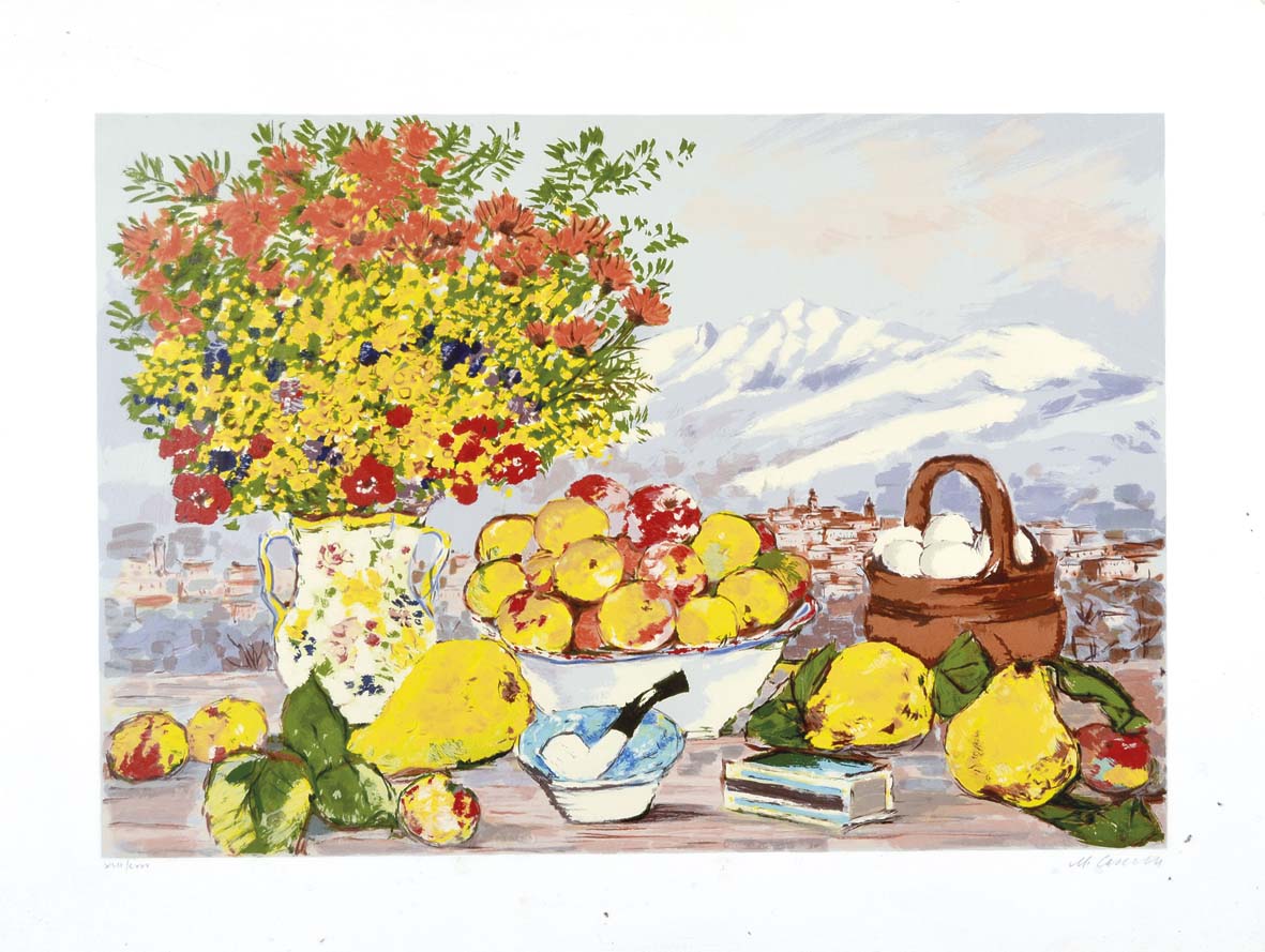 CASCELLA MICHELE Ortona a Mare 1892 - 1989 Natura morta con panorama litografia es. XLII/LXXV 70x90 firma in basso a destra tiratura in basso a sinistra