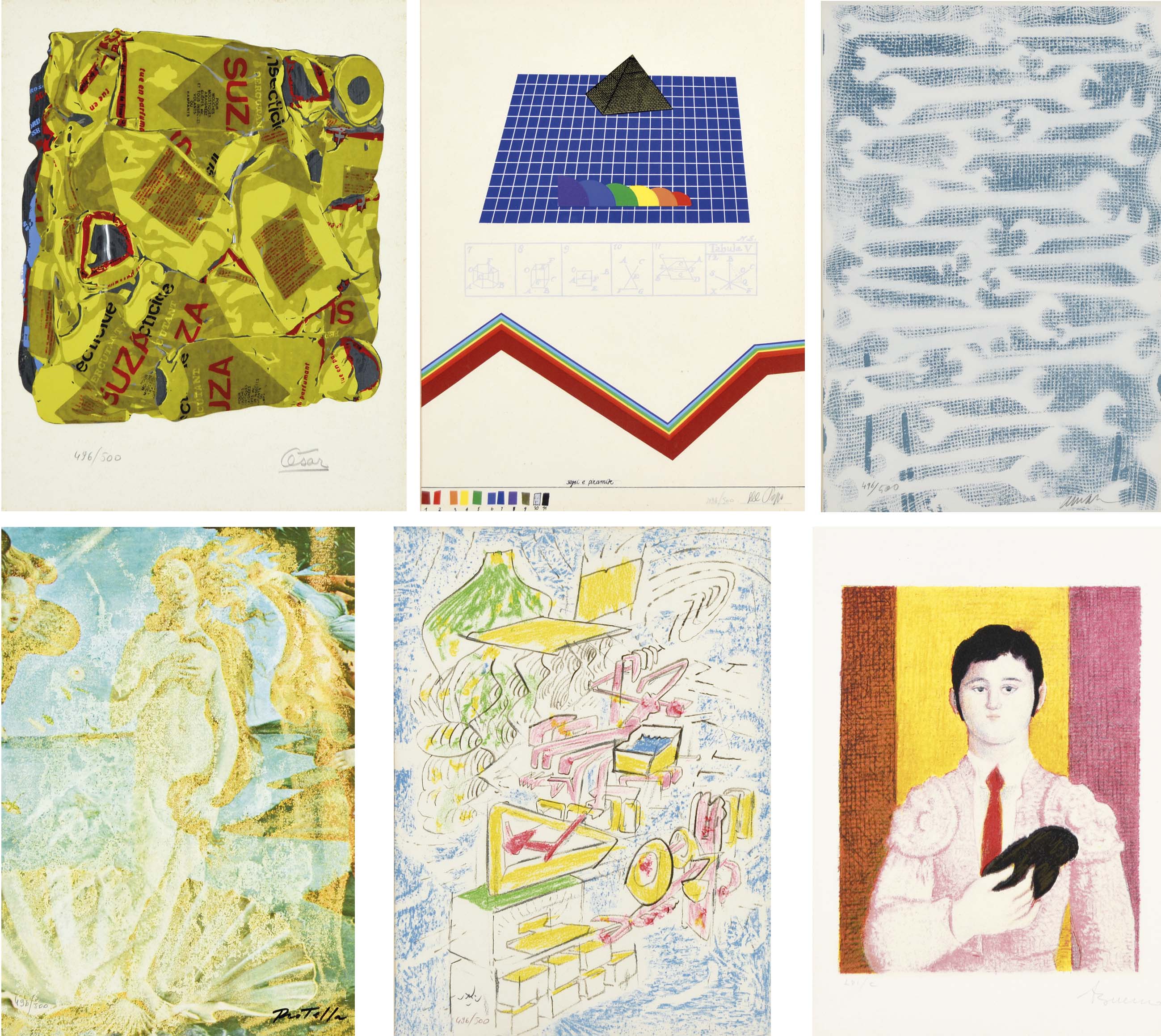 AUTORI VARI Soggetti vari lotto di 6 serigrafie tutte firmate e numerate in basso Cesar: Compressione es. 496/500 cm. 35x28 Del Pezzo: Segni e piramide es. 496/500 cm. 40x30 Arman: Impronte es. 496/500 cm. 40x30 Rotella: La nascita di Venere cm. 496/500 cm. 30x20 Matta: senza titolo es. 496/500 cm. 40x30 A. Bueno: Torero es. LVI/C cm. 33x23
