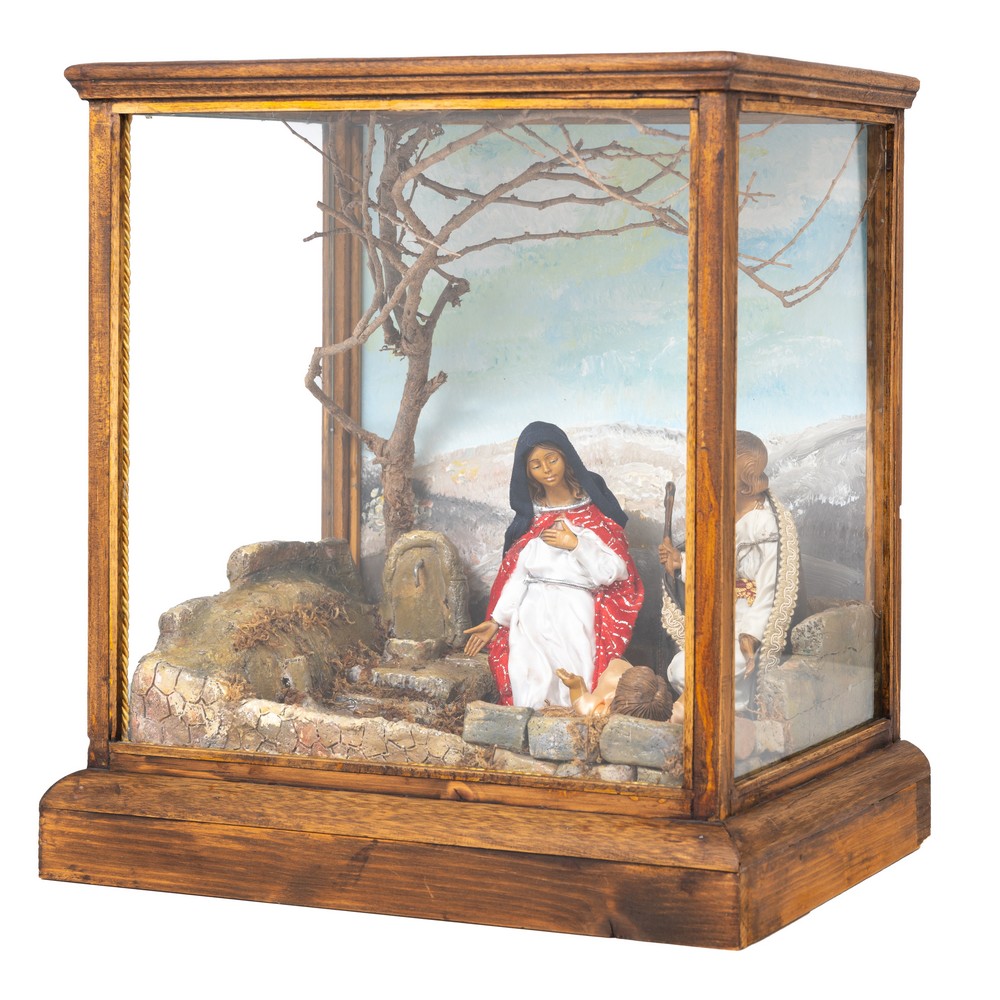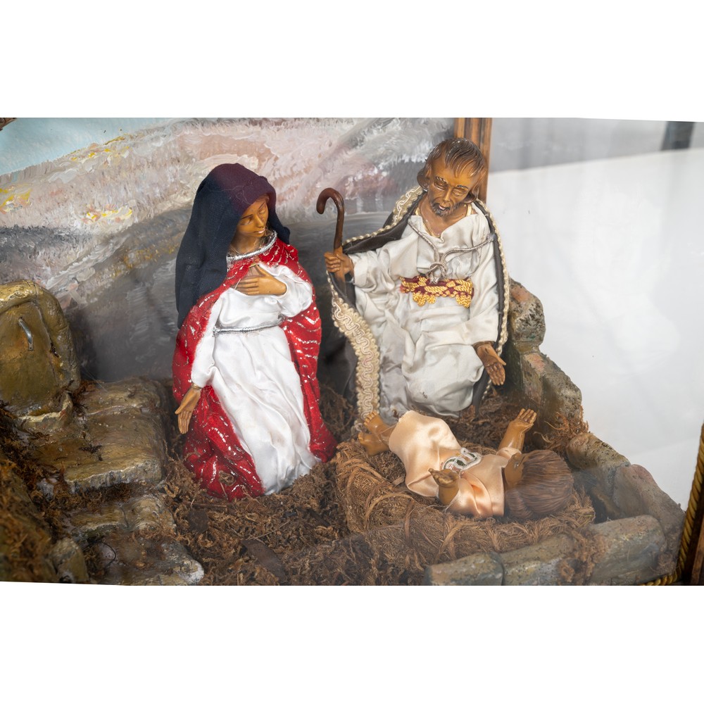 PRESEPE entro teca in legno con personaggi in gesso smaltato e dipinto.