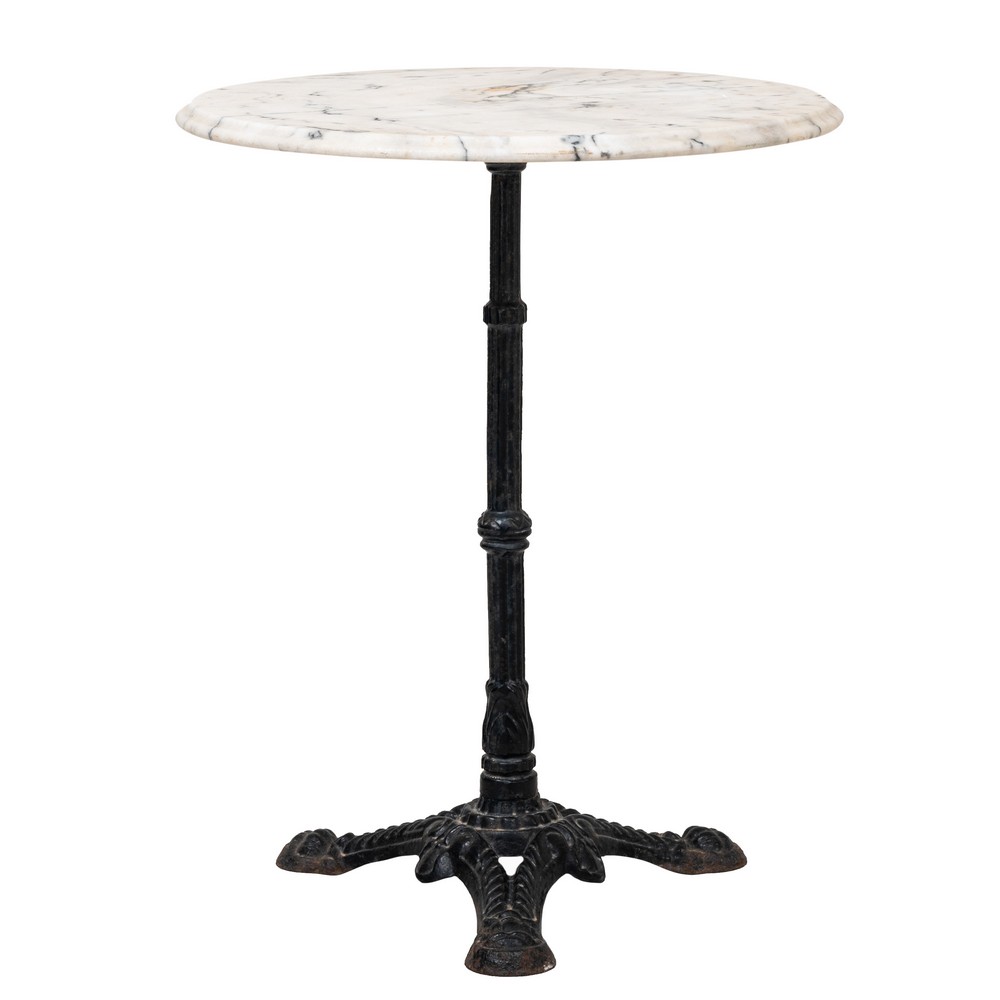 TAVOLINO da esterno con base in ghisa, piano in marmo bianco.
