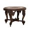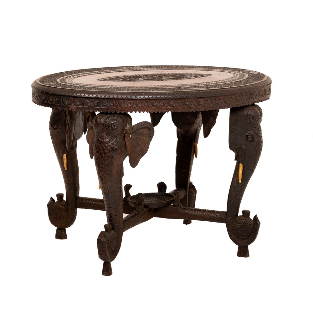Tavolino in legno di forma ovale riccamente intagliato, con quattro piedi a testa di elefante, con crociera. Periodo coloniale inglese.