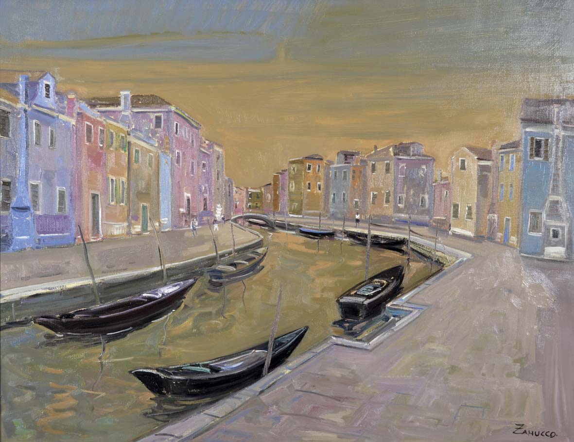 ZANUCCO PAOLO Venezia 1964 Verso sera a Burano olio su tela 70x90 firma in...