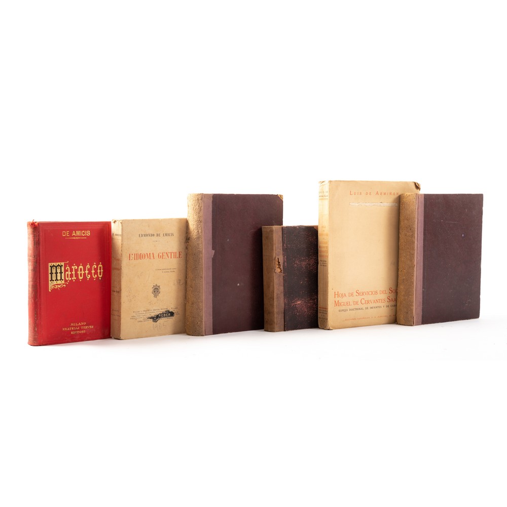SEI VOLUMI DI LETTERATURA: 1) Michele Cervantes di Saavedra L’INGEGNOSO IDALGO DON CHISCIOTTE DELLA MANCIA CON SANCIO PANCIA, ed. Milano Enrico Politti 1870. In 2 volumi in 8°. Rilegature coeve in mezza tela e piatti cartonati. Pagine ben tenute con rade bruniture del tempo. ben illustrato nel t. da numerosiss. figure xilografate da Pokret, ornati da grandi iniziali figurate a vignetta e finali. Questa celebre opera è introdotta da un “giudizio critico sul romanzo e la vita dell'Autore, di Antonio Balbiani”. Uno dei due dorsi parzialmente slegato. Raro. Pp. 630; 712. 2) Luis de Armiran HOJA DE SERVICIOS DEL SOLDADO MIGUEL DE CERVANTES SAAVEDRA, ESPEJO DOCTRINAL DE INFANTES Y DE CABALLEROS, ed. Almagro, Madrid 1941. In 8° grande. Brossura editoriale in bicromia. Mutila della fotoapplicazione al piatto. Tagli marginosi. Fioriture sparse ma ininfluenti. Pagine ben conservate. In ottimo stato con pagine ancora intonse. Pp. 251 con tavole in b/n f. t. 3) Edmondo De Amicis L’IDIOMA GENTILE, ed. Milano, Fratelli Treves 1905. In 8° piccolo. Brossura editoriale in bicromia. Tagli marginosi. Leggera imbrunitura generale causata dal tempo. Pp. 432 (8). 4) Edmondo De Amicis MAROCCO, ed. Milano, Fratelli Treves 1908. In 8° piccolo. Bella legatura editoriale in percallina rigida con titoli incisi in oro al piatto e al dorso. usure d’uso alla coperta. In ottime condizioni. Pp. 483. 5) Edmondo De Amicis ALLE PORTE D’ITALIA, ed. Sommaruga 1884. In 8° piccolo. Rilegatura coeva in mezza tela e piatti cartonati. Usure e alcune pagine con piccole forature da tarlo ormai debellato. Pp. 355 (8).
