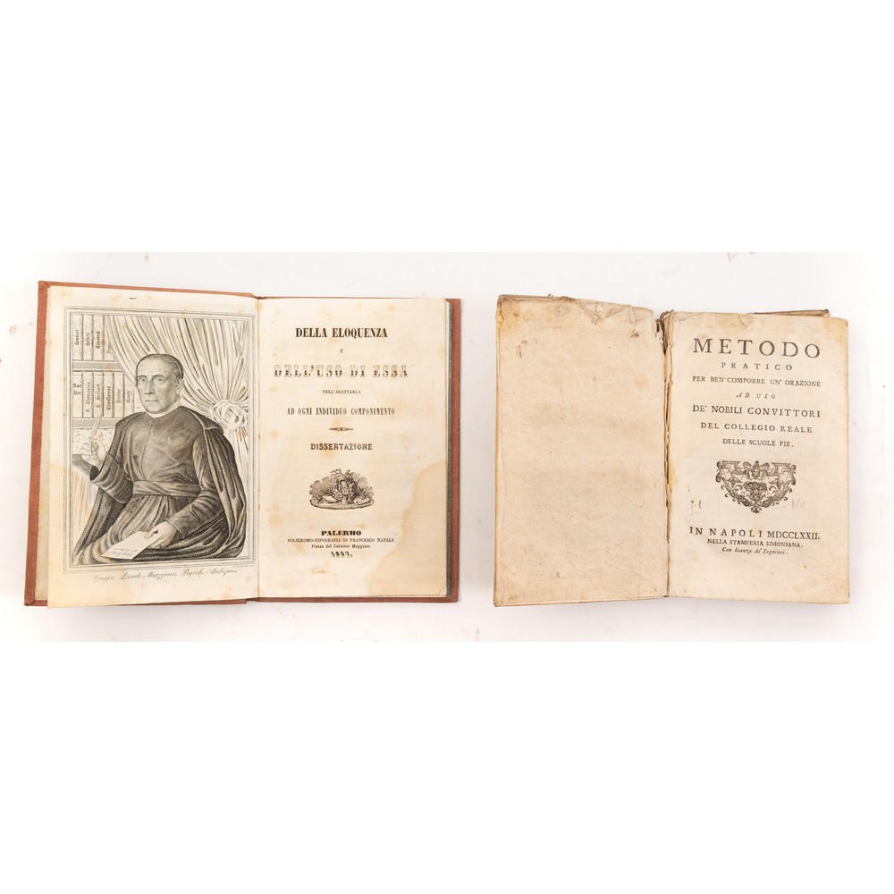 DUE RARISSIMI VOLUMI DI ELOQUENZA DEL XVIII E XIX SECOLO: 1) METODO PRATICO PER BEN COMPORRE UN’ORAZIONE AD USO DE’ NOBILI CONVITTORI DEL COLLEGIO REALE DELLE SCUOLE PIE, In Napoli MDCCLXXII, nella Stamperia Simoniana. In 16°. Rarissimo. Legatura coeva in piena pergamena muta. Piatto anteriore e parte del dorso alto strappati. Testatine e filetti infratestuali incisi. Pp. 234 (2). 2) P. Gregorio Liardo DELL’ELOQUENZA E DELL’USO DI ESSA NELL’ADATTARLA AD OGNI COMPONIMENTO, ed. Palermo Policromo – Tipografia di Francesco Natale 1857. In 8° piccolo. Rilegatura successiva in piena tela rigida e tagli spruzzati. Macchie e gore superficiali alle pagine. In ottimo stato di conservazione. In antiporta incisione del Padre Gregorio Liardo. Pp. 104.