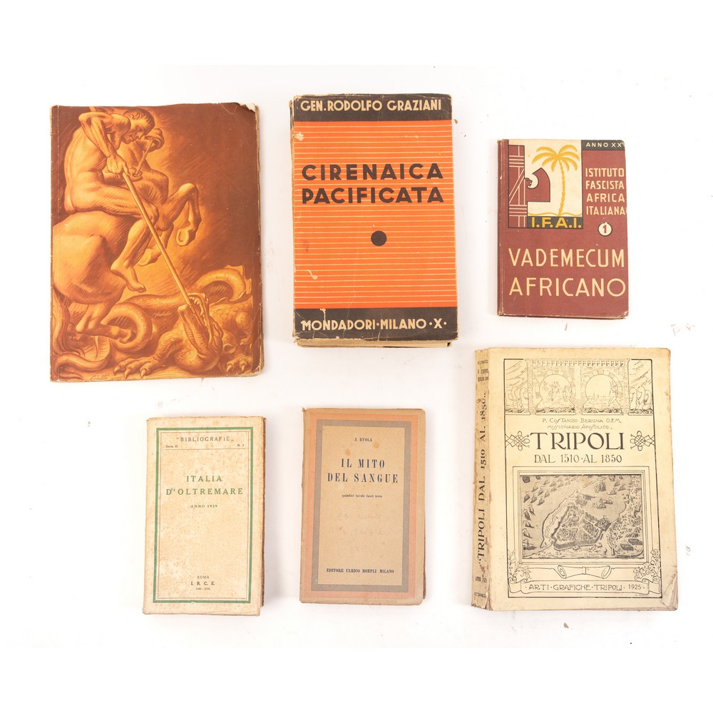 SEI PUBBLICAZIONI DEL PERIODO FASCISTA: 1) Istituto Nazionale per le relazioni culturali con l’Estero. Centro Studi di Diritto e Politica Coloniale Fascista BIBLIOGRAFIA DELL’ITALIA D’OLTREMARE, ed. Roma 1940 – XIX. in 16°. Brossura editoriale marginosa. Alcune sporcizie superficiali e qualche macchia sporadica, ma nel complesso in ottimo stato. Pp. XL, 191. 2) Istituto Fascista dell’Africa Italiana – Roma - VADEMECIM AFRICANO, ed. Anno XX E.F. Presentazione di Amedeo Fani. Stampato su pagine patinate, con illustrazioni in nero nei testi ed alcune cartine f.t. Legatura editoriale cartonata figurata a colori. In ottime condizioni di conservazione. Pp. 128.3) Gen. Rodolfo Graziani CIRENAICA PACIFICATA, ed. A. Mondadori, Milano 1932 – X. Brossura editoriale a colori. Coperta slegata al dorso. in 8°. 1^ edizione. In ottime condizioni. Pp. (12), 308 con una mappa della Cirenaica più volte ripiegata in fine. 4) VOLONTARI DELL’ESERCITO NELLA GUERRA DI SPAGNA, ed. Turati Lombardini 1939 – XVII. Opuscolo di 27 cm, con numerose illustrazioni in nero e due carte geografiche ripiegate in fine. Brossura editoriale con un disegno di Ciotti. In ottime condizioni. Interessanti le fotografie dell'istituto Luce. A cura del Ministero della guerra nella Giornata celebrativa dell'esercito del 9 maggio 1939-XVII-IV dell'Impero. Pp. 63. 5) Julius Evola IL MITO DEL SANGUE, ed. Ulrico Hoepli 1937 – XV. Con quindici tavole fuori testo. Brossura editoriale marginosa. Fioriture ai tagli. In ottime condizioni. Stampato su carta velina. Pp. 273 e XV tavole f. t.6) P. Costanzo Begna O. F. M. TRIPOLI DAL 1510 AL 1850, ed. Stab. Nuove Arti Grafiche Tripoli 1925. Con dedicatori al Conte Giuseppe Volpe Governatore della Tripolitania. Foto del Conte Volpe in antiporta. In 8°. Brossura editoriale illustrata. Con immagini a piena pagina fuori testo in b/n. In ottime condizioni. Pp. 333 (2).