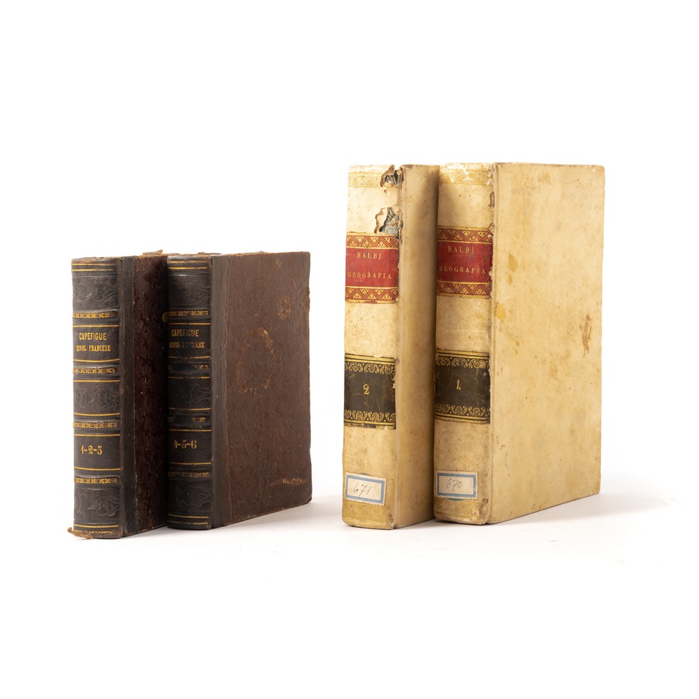 QUATTRO VOLUMI DI ARGOMENTO STORICO E GEOGRAFICO: 1) Adriano Balbi COMPENDIO DI GEOGRAFIA COMPILATO SU DI UN NUOVO PIANO CONFORME AGLI ULTIMI TRATTATI DI PACE, ed. Torino, Pomba 1834. In 2 volumi in 8°. Legature coeve in piena pergamena con titoli e fregi in oro entro tasselli ai dorsi. Tagli spruzzati. Qualche sparsa brunitura del tempo. Volumi in ottime condizioni. Pp. CXXXV, 1858, (2) continuative. 2) Francesco Biancardi L’EUROPA DURANTE LA RIVOLUZIONE FRANCESE, OPERA STORICA DI CAPEFIGUE, ed. Milano, coi tipi Borroni e Scotti, 1844 – 1845. 2 volumi che comprendono 6 tomi. In 16°. Bella legatura coeva in mezza pelle con piatti cartonati arabescati. Titoli, filetti e quattro nervature decorate ai dorsi in oro. Con 6 antiporte incise in rame raffiguranti la presa della Bastiglia e 5 ritratti. Prima edizione italiana. In eccellenti condizioni. Pp. 226; 200; 263; 208; 200; 207.