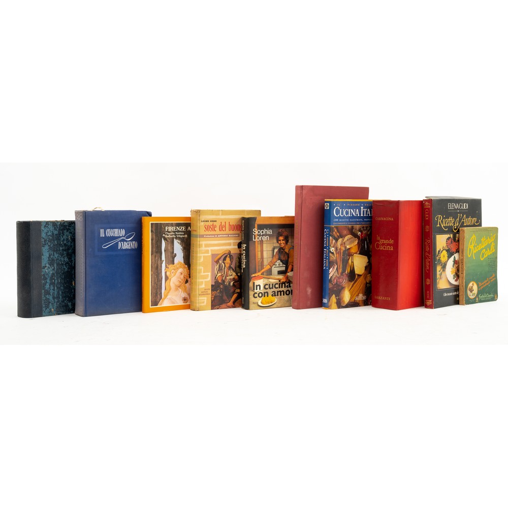 DIECI VOLUMI DI RICETTE E CUCINA in lingua italiana del XX secolo: 1) Sophia Loren IN CUCINA CON AMORE, ed. Rizzoli 1971. 1^ edizione. Legatura editoriale in piena tela rigida con sopraccoperta illustrata. Cm 23 x 16. Pp. 345 (6). 2) Leone Gessi SOSTE DEL BUONGUSTAIO, ed. SEI 1957. Prefazione di Antonio Baldini. Legatura editoriale rigida illustrata. Cm 24 x 18. Pp. VIII, 404. 3) Paolo Piazzesi - a cura di - IL PIACERE DELLA BUONA CUCINA ITALIANA, ed. Bonechi 1996. Legatura editoriale in pelle con titoli dorati. Sopraccoperta editoriale illustrata. Pp. 223. 4) Luigi Carnacina LA GRANDE CUCINA, ed. Garzanti 1960. 1^ edizione. Con 3715 ricette, 242 soggetti a colori, 221 soggetti in nero, 139 disegni. Legatura editoriale in piena pelle con titoli in oro al dorso e incisioni a freddo al piatto. Cm 27 x 19. Opera fondamentale della cucina italiana. Pp. 1100. 5) Elena Guidi RICETTE D’AUTORE, ed. Rizzoli 1983. Fotografie di Uliano Lucas. Legatura editoriale in Balacron con titoli dorati al piatto e al dorso. Cm 27 x 22. Volume entro custodia editoriale in cartone illustrato. Pp. 231 (8). 6) Claudio Nobbio / Raffaella Viligiardi FIRENZE A TAVOLA, ed. Cafè Club 1985. Legatura editoriale rigida con sopraccoperta editoriale illustrata. Cm 22 x 23. Pp. 136 con 18 fumetti fuori testo. 7) AA. VV. IL CUCCHIAIO D’ARGENTO, ed. Editoriale Domus 1951. La Collana della Felicità 1. Legatura editoriale in tela rigida . pp. 658. Cm 24 x 17. Usure d’uso. Una delle opere fondamentali della cucina italiana. 8) Giovanni Nelli IL RE DEI CUOCHI, ed. Nerbini 1930 – VIII. Cm 21 x 16. Rilegatura coeva in mezza pelle con angoli e piatti cartonati. Pagine leggermente brunite dal tempo. Pp. 779. 9) Amedeo Pettini RICETTARIO CARLI, ed. Fratelli Carli 1953. Lo storico ricettario della Carli nella versione illustrata e figurata a colori. Cm 20 x 14. Brossura editoriale semirigida illustrata. Pp. 227. In ottime condizioni. 10) Felice Cunsolo GLI ITALIANI A TAVOLA, ed. Gorlich, Milano 1959. Cm. 30 x 21,5. Legatura editoriale in tela con titoli dorati al dorso. sopraccoperta assente. 1^ edizione. “Opera di alta gastronomia in cui vengono esaminate le particolarità di ogni cucina regionale e descritti i piatti più caratteristici”. Pp. 252, (2); con numerosi disegni n.t.