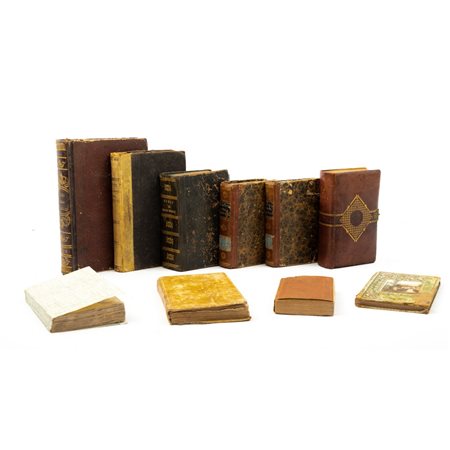 DIECI VOLUMI DI VARIA DEL XIX SECOLO IN 16°: 1) Alessandro Dumas LA REGINA MARGOT OSSIA LA NOTTE DI SAN BARTOLOMEO IN FRANCIA, ed. Borroni e Scotti, 1854. TRADUZIONE DI Ercole Marenesi. Rilegatura coeva in mezza pelle e piatti cartonati. Antiporte e incipit dei 6 libri incise. Unico tomo che raccoglie i 6 volumetti dell’opera completa. 2) Ferdinando Schultz PICCOLA GRAMMATICA LATINA, ed. Napoli, Vincenzo Morano 1884. Rilegatura coeva in mezza pergamena e piatti cartonati. Pp. X, 333. 3) G. Regnault Warin IL CIMITERO DELLA MADDALENA, ed. Pe – King 1801. 2 volumi che contengono quattro tomi. Incisioni alle quattro antiporte. Ex libris di Francesco de Silvestri Falconieri. Rilegatura coeva in mezza pelle e piatti cartonati. 4) M. Tullii Ciceronis DE OFFICIIS, Juxta Recensionem Graevianam, ed. Neapoli Ex Typographia Raphaelis Di Napoli 1834. Legatura coeva in piena pergamena rigida muta. Pp. 256. Segni di tarlo ormai debellato alle ultime pagine. Legatura parzialmente slegata. 5) AA. VV. GUIDA DELLE FAMIGLIE 1869, ed. Milano, Alessandro Lampugnani Editore. Rilegatura coeva in mezza pelle e piatti cartonati. In 16° grande. Testatine e finalini illustrati. Testo stampato su due colonne. Pp. 591. 6) AA.VV. STORIA DELLE QUATTRO MONARCHIE ASSIRI PERSIANA GRECA E ROMANA, ed. Giacinto Marietti 1842. Rilegatura in carta a colla. Brossura posteriore presente nella rilegatura. Pp. 353.7) IL NUOVO TESTAMENTO tradotto da Giovanni Diodati, ed. Roma, Deposito di Sacre Scritture 1894. Legatura editoriale in cartonato rigido con titolo impresso a freddo. In 16° piccolo. Stampato su due colonne 466.8) M.me Menard LA CROIX AU BORD DU CHEMIN, ed. Tours Mame et C. 1856. Legatura editoriale artistica. Qualche parziale mancanza alla decorazione del piatto anteriore. Pp. 137 con incisione in antiporta. 9) Giuseppe Riva MANUALE DI FILOTEA, ed. Bergamo Istituto Italiano di Arti Grafiche 1898. Bella legatura in pieno vitello fregiato e decorato in oro. piatto anteriore con fermaglio. Tagli dorati. Contropiatti a cornice oro. Greca in oro e decorazione a freddo ai piatti e al dorso. leggera mancanza al taglio anteriore sx dell’antiporta incisa. Pp. VIII, 1046.