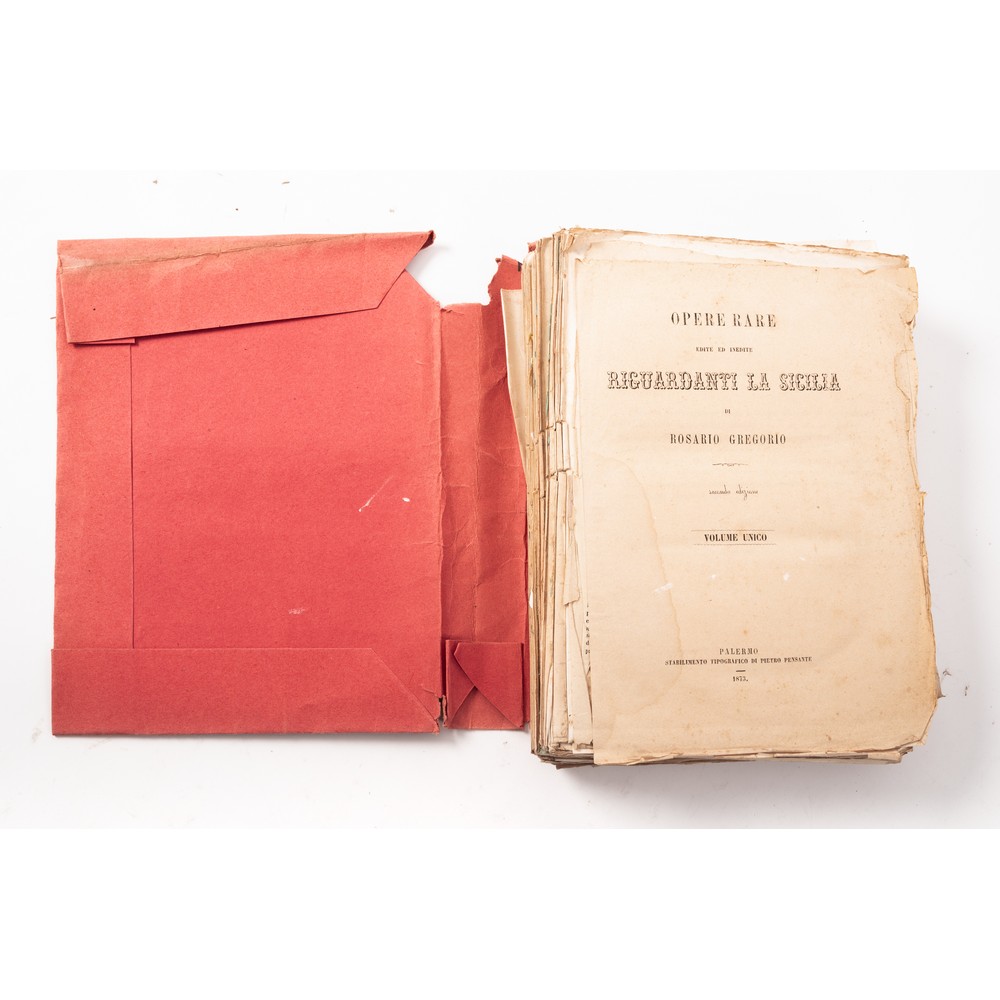 Rosario Gregorio OPERE RARE EDITE ED INEDITE RIGUARDANTI LA SICILIA, ed. Palermo, Stabilimento Tipografico di Pietro Pensante, 1873. In 8° grande. Opera mutila della coperta. Pagine interamente slegate ma tutte presenti. Stampato su due colonne. Pagine leggermente brunite. Tagli marginosi. Opera rara. Pp. XIV, 840, X.