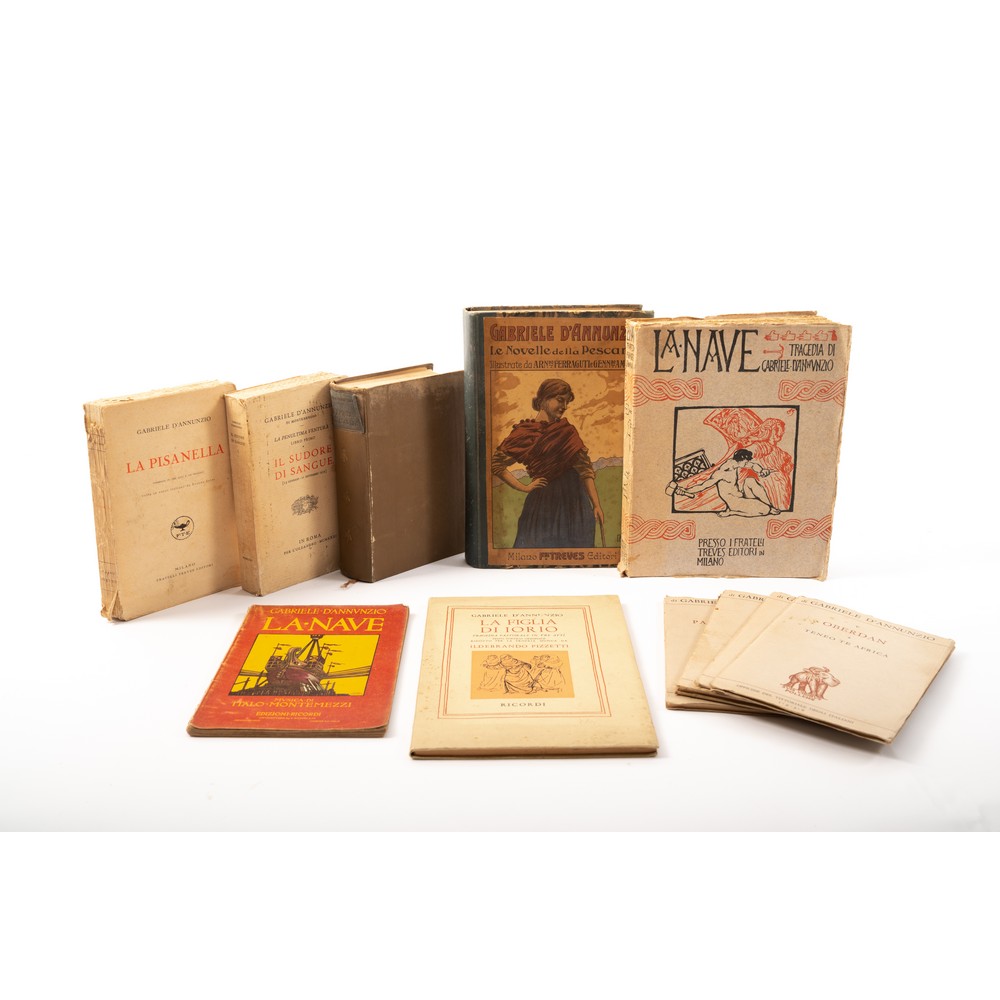UNDICI VOLUMI DI GABRIELE D’ANNUNZIO: 1) LE NOVELLE DELLA PESCARA, ed. Milano Fratelli Treves 1910. Illustrate da A. Ferraguti e G. Amato. In 8°. Rilegatura successiva che contiene la brossura originale applicata al piatto. Edizione rara. Pp. 519 (1). 2) LA NAVE. TRAGEDIA DI GABRIELE D’ANNUNZIO, ed. Fratelli Treves, Milano 1921. In 8°. Brossura editoriale con tagli marginosi con fioriture. In perfette condizioni di conservazione. Frontespizio, fregi e iniziali ornate di Duilio Cambellotti. Pp. 249 (2). 3) IL SUDORE DI SANGUE, ed. Roma , per l’Oleandro MCMXXXI. In 16°. Libro primo. Brossura editoriale con tagli marginosi. In ottime condizioni. Pp. 391.4) LA PISANELLA, ed. Fratelli Treves, Milano 1927. In 8°. Brossura editoriale con tagli marginosi. In ottime condizioni di conservazione. Pp. 292. 5) LE FAVILLE DEL MAGLIO. IL VENTURIERO SENZA VENTURA, ed. Fratelli Treves, Milano 1924. In 8°. Dal 1° al 10° migliaio. Legatura successiva in piena tela rigida con titoli al tassello al dorso, che comprende la brossura editoriale. In perfette condizioni di conservazione. Pp. 653.6) LA NAVE, ridotta da Tito Ricordi per la musica di Italo Montemezzi, ed. G. Ricordi & C., Milano 1918. Brossura editoriale figurata a colori da Guido Marussig. Edizione originale del libretto d’opera. Piccola mancanza al piatto posteriore. In ottime condizioni. Pp. 83. 7) LA FIGLIO DI IORIO. TRAGEDIA PASTORALE IN TRE ATTI, ed. Milano, Ricordi & C., 1954. Brossura editoriale cartonata con sopraccoperta figurata. Testo poetico originale ridotto per la propria musica da Ildebrando Pizzetti. Prima rappresentazione Teatro San Carlo. Napoli 4 Dicembre 1954. Pp. 82. 8) TENEO TE AFRICA, ed. Officine del Vittoriale degli Italiani,, 1936. 4 volumetti su 6 ( mancano 1 e 2) In 16°. Brossure editoriali figurate, con riproduzioni (ad un quarto del formato originale) dei seguenti sei autografi: Non dolet Arria dixit; Lealtà passa tutto; Oberdan; Adua. In ottimo stato di conservazione. 1^ edizione della raccolta. Pp. 50; 37; 23; 38.