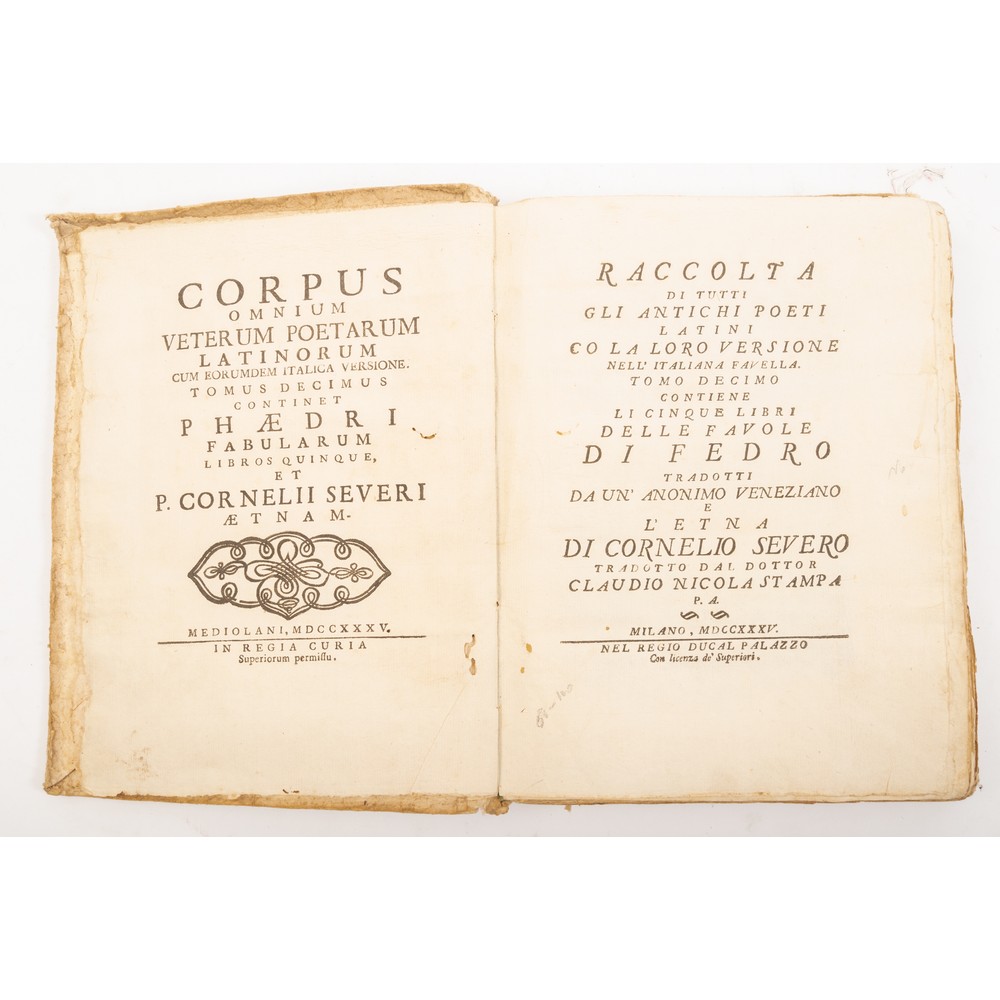 RACCOLTA DI TUTTI GLI ANTICHI POETI LATINI CO LA LORO VERSIONE NELL’ITALIANA FAVELLA … DELLE FAVOLE DI FEDRO … E L’ETNA DI CORNELIO SEVERO TRADOTTO DAL DOTTOR CLAUDIO NICOLA STAMPA, Milano, MDCCXXXV nel Regio Ducal Palazzo. In 8°. Legatura rustica cartonata, con pagine pulite e ben tenute. Tagli marginosi. Pp.(22), 247, 122, (2).