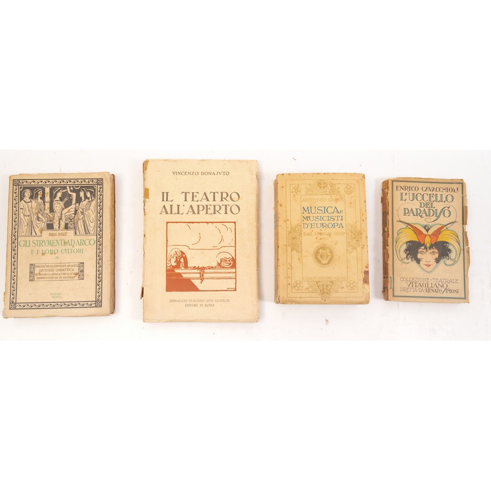 QUATTRO VOLUMI DI ASTORIA DEL TEATRO E DELLA MUSICA: 1) Antonio Capri MUSICA E MUSICISTI D’EUROPA dal 1800 al 1930, ed. Ulrico Hoepli 1931. In 8° piccolo. Bella brossura con sopraccoperta decorata in oro, con tagli marginosi. Qualche sporadica macchiolina. Opera in ottimo stato di conservazione. Pp. XV, 550. 2) Enrico Cavacchioli L’UCCELLO DEL PARADISO, ed. Vitagliano 1920. In 8° piccolo. Brossura editoriale marginosa figurata a colori. Piatto parzialmente slegato. Fioriture ai tagli. Pp. XL, 135. 3) Isaia Billè GLI STRUMENTI AD ARCO E I LORO CULTORI, ed. Ausonia, Roma 1928. . Brossura editoriale marginosa figurata con ali. Fioriture ai tagli. Pagine ancora intonse, pulite e ben tenute. Note di possesso manoscritte. Pp. XI, 219. 4) Vincenzo Bonajuto IL TEATRO ALL’APERTO, ed. Sindacato italiano Arti Grafiche, Roma s. d. Raro. in 8° grande. . Brossura editoriale marginosa figurata a colori. Piatto parzialmente slegato. Pagine pulite e ben tenute. Pp. 105 con tavole f.t.