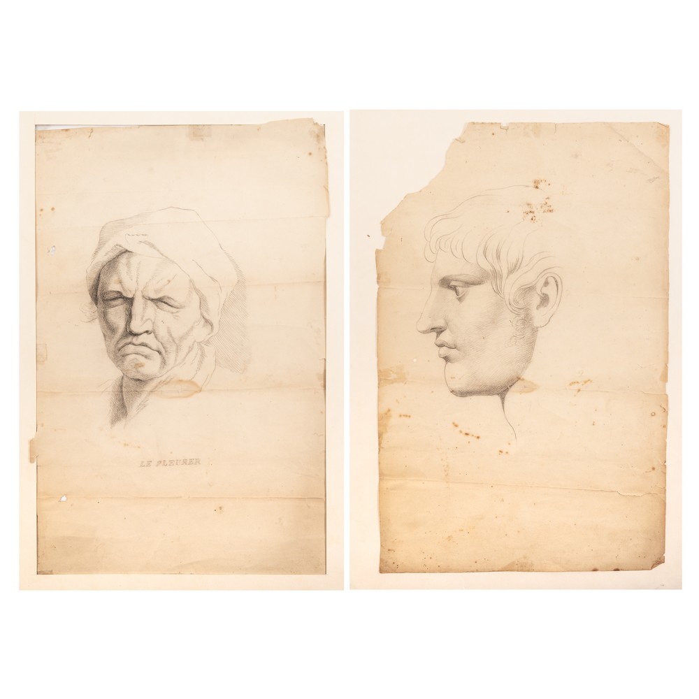 5) DUE DISEGNI CHE RITRAGGONO VOLTI MASCHILI, bozzetti a matita attribuibili a Charles Le Brun (1619 – 1690). Uno dei due disegni è mutilo dell’angolo alto sinistro. L’artista fu pittore ufficiale del Re Luigi XIV e Presidente dell’Accademia Reale di Pittura e Scultura. La caratterizzazione della scena con tratti marcati e la severità di immagine da lui attuata, determinò una vastissima influenza sulla scena pittorica e stilistica contemporanea. I disegni sono entrambi di dimensione cm 41 x 27.