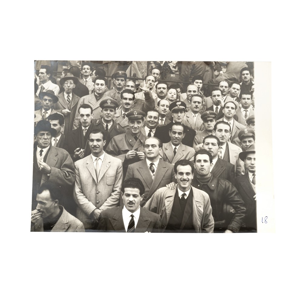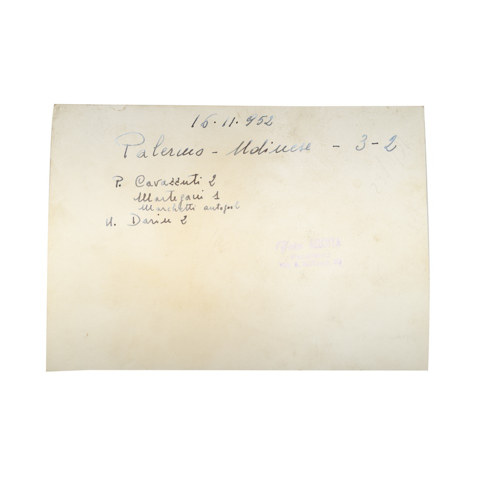 UNA FOTOGRAFIA in bianco e nero datata 16 Novembre 1952, di cm 18 x 13 relativa alla partita di calcio Palermo – Udinese vinta 3 a 2 dal Palermo. La fotografia è dello studio fotografico Fratelli Allotta che operò, fino al 1961, all'interno del Palazzo Guccia, in via R. Settimo n. 30.