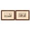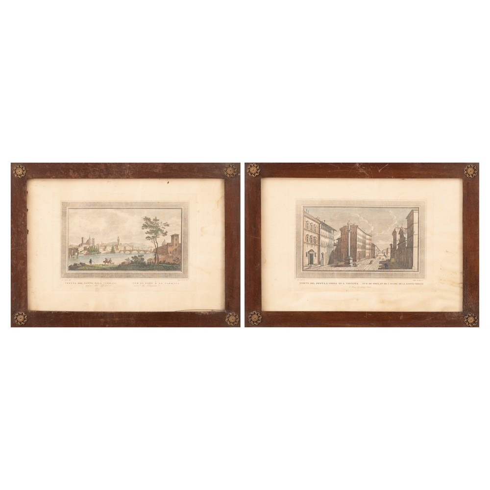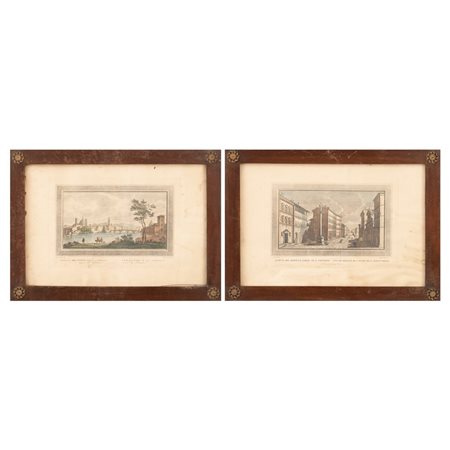 COPPIA DI INCISIONI a colori raffiguranti "Veduta di città" entro cornici in legno di mogano.