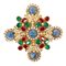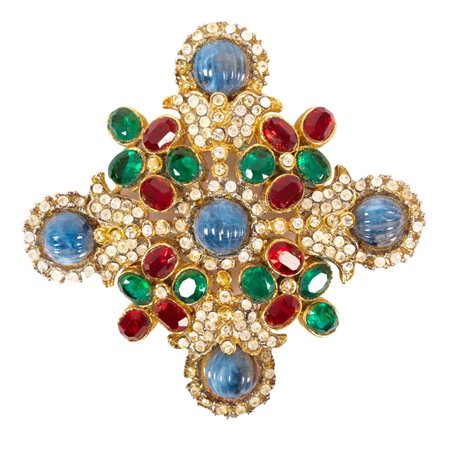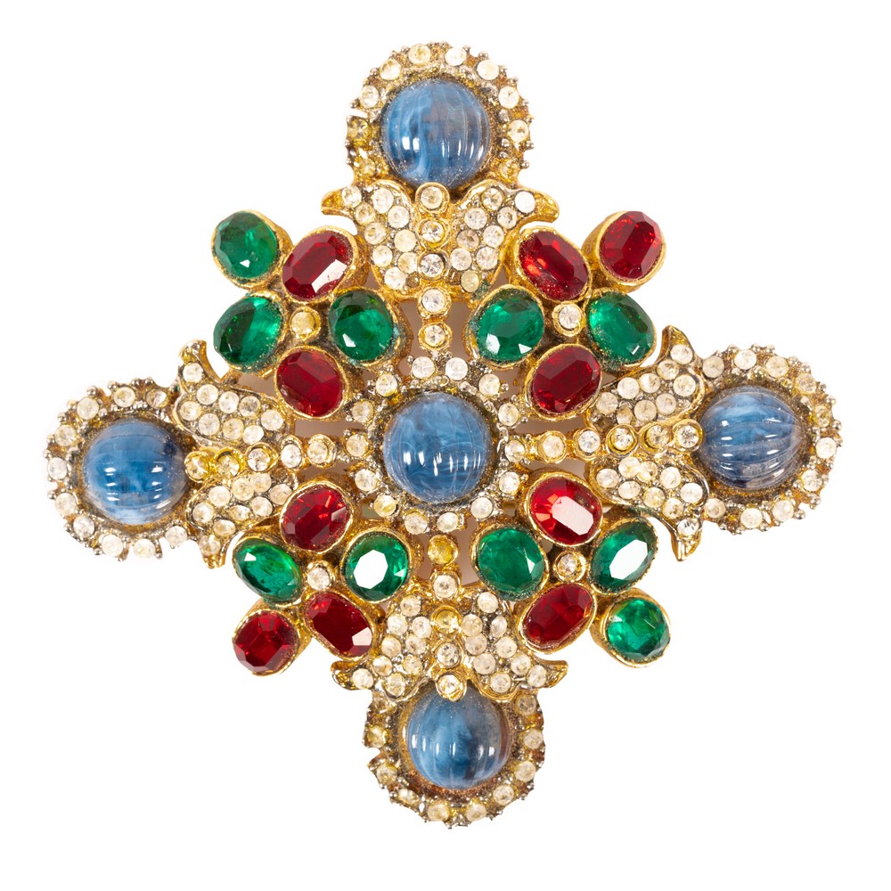 Grande spilla in metallo dorato con cabochon in pasta vitrea manto di Madonna, zirconi ovali multicolor e pavè di zirconi bianchi.