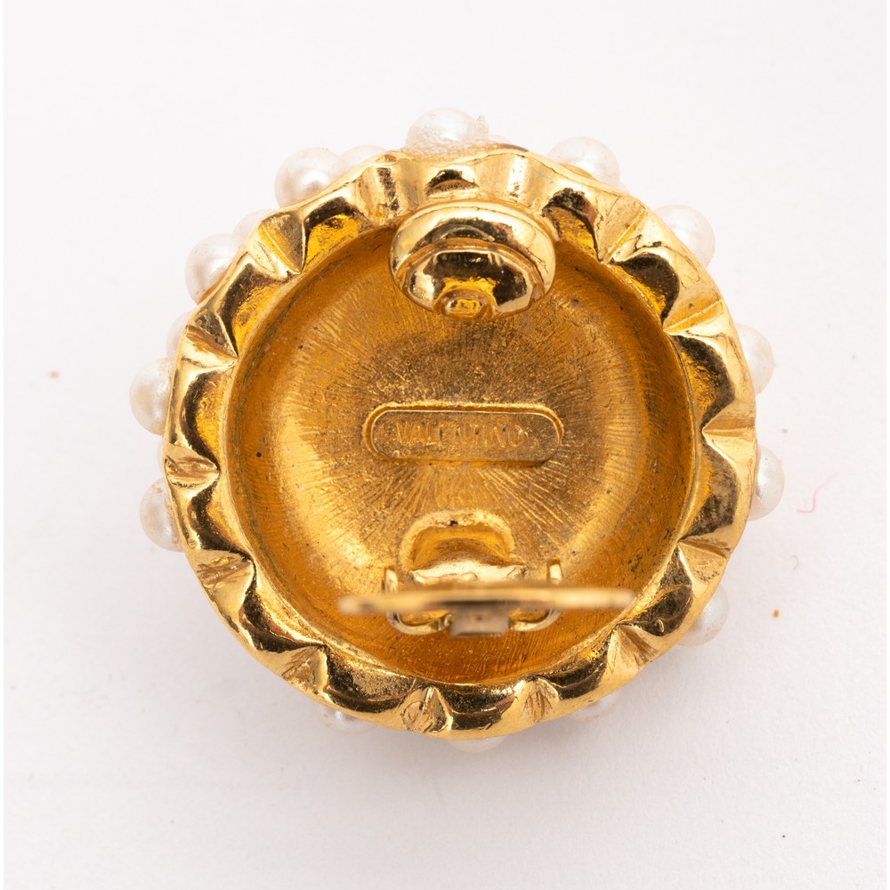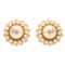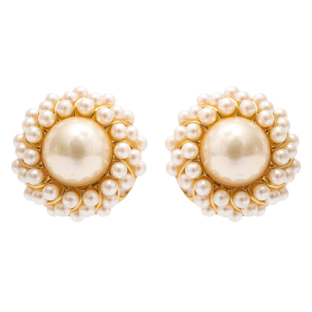 Orecchini a clip in metallo dorato con mezza perla cabochon centrale contornata da tre file di micro perline. Marchio di produzione incusso.