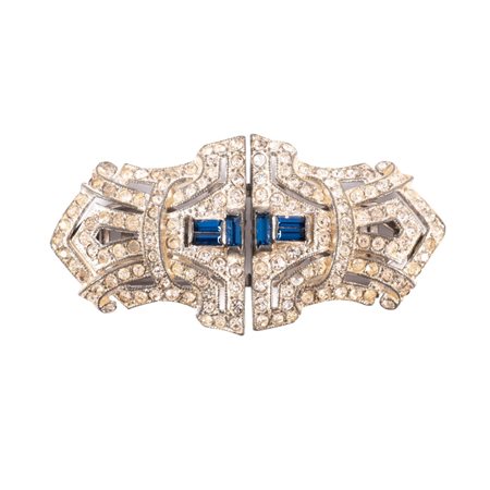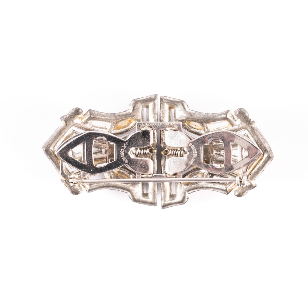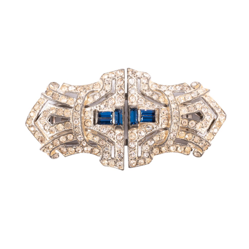 Spilla “Duette” in metallo argentato, strass bianchi e color zaffiro. Sagoma a losanga con decori geometrici. Marchio di produzione incusso e numero seriale di produzione.