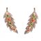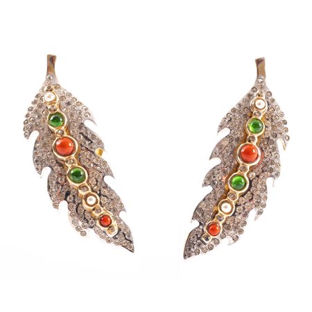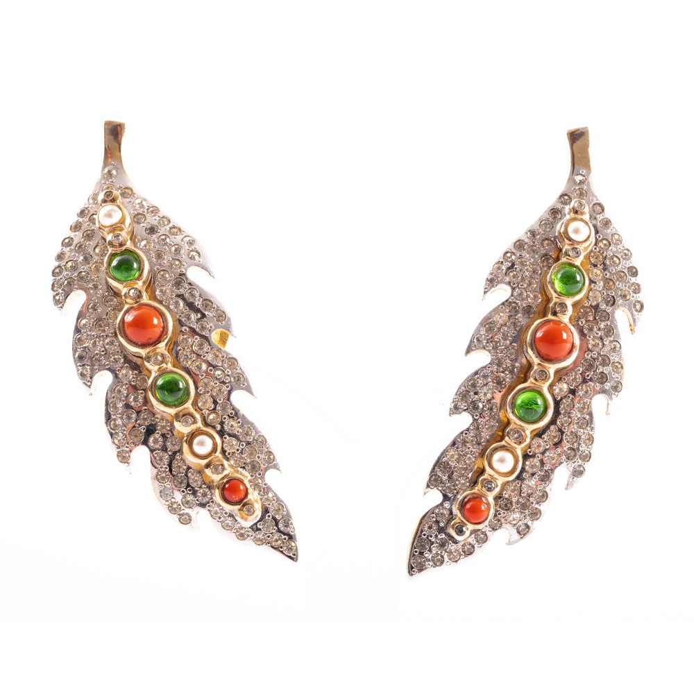 Grandi orecchini clips a foglia in metallo dorato con cabochon in vetro verde, perline bianche e rosse, pavè di zirconi. Marchio di produzione.