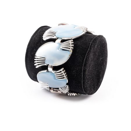 Bracciale in metallo argentato composto da elementi sagomati e decorati con pastiglie celesti. Marchio di produzione incusso.