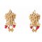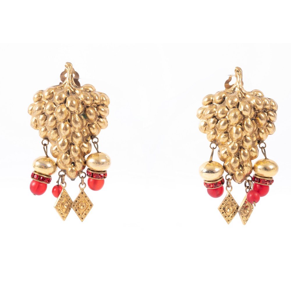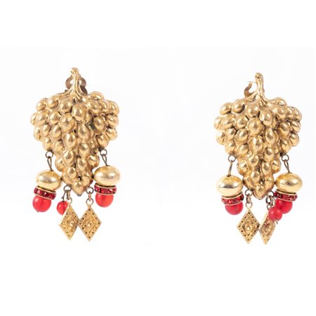 Orecchini in metallo dorato a grappolo d’uva con piccoli pendenti in metallo dorato, strass dorati e sfere rosse. Marchio impresso.