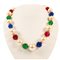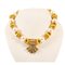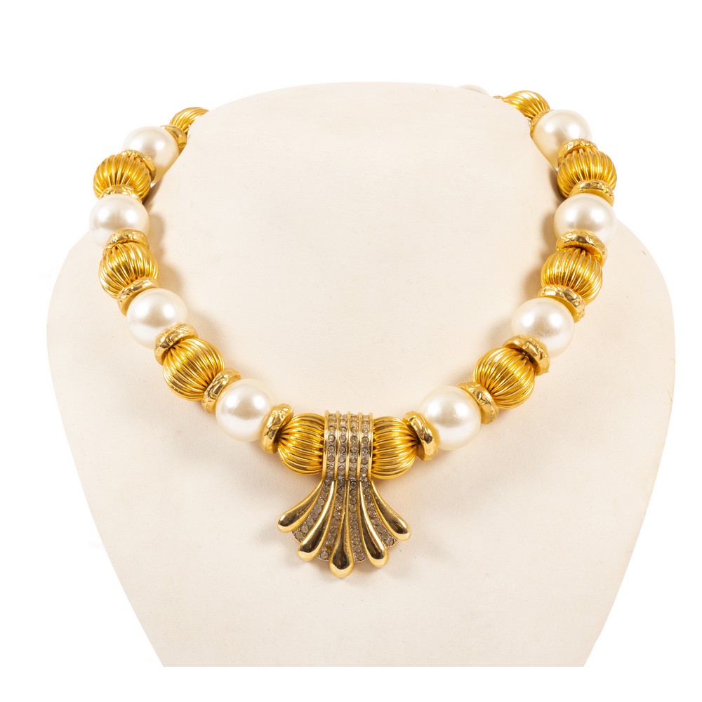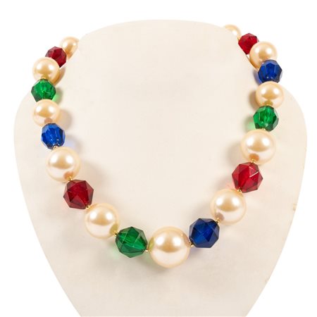 Collana con grandi perle ed intercalari multicolor. Collana con perle e sfere baccellate in metallo dorato, centrale a palmetta con zirconi bianchi.